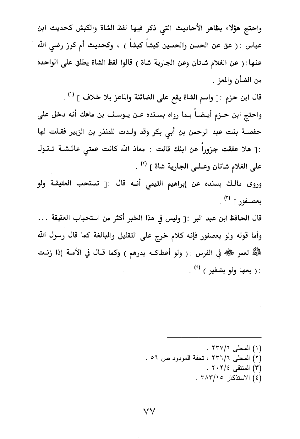 واحتج ابن حزم أيضاً بما رواه بسنده عن يوسف بن ماهك أنه دخل على حفصة بنت عبد الرحمن بن أبي بكر وقد ولدت للمنذر بن الزبير فقلت لها: [هلا عققت جزوراً عن ابنك قالت: معاذ الله كانت عمتي عائشة تقول على الغلام شاتان وعلى الجارية شاة] (¬2).