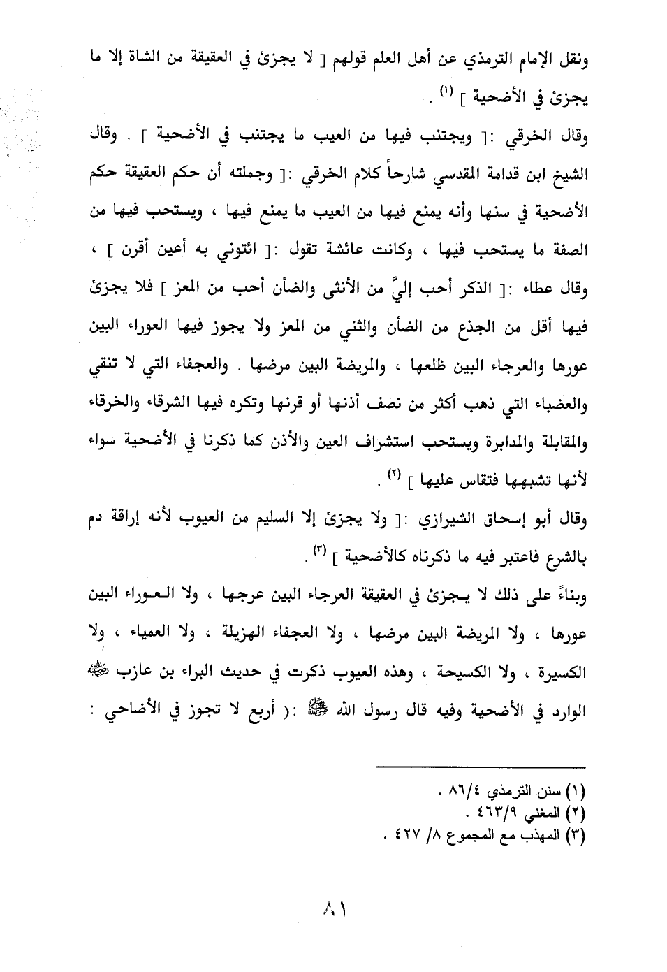 وقال الخرقي: [ويجتنب فيها من العيب ما يجتنب في الأضحية]. وقال الشيخ ابن قدامة المقدسي شارحاً كلام الخرقي: [وجملته أن حكم العقيقة حكم الأضحية في سنها وأنه يمنع فيها من العيب ما يمنع فيها، ويستحب فيها من الصفة ما يستحب فيها، وكانت عائشة تقول: [ائتوني به أعين أقرن]، وقال عطاء: [الذكر أحب إليَّ من الأنثى والضأن أحب من المعز] فلا يجزئ فيها أقل من الجذع من الضأن والثني من المعز ولا يجوز فيها العوراء البين عورها والعرجاء البين ظلعها، والمريضة البين مرضها. والعجفاء التي لا تنقي والعضباء التي ذهب أكثر من نصف أذنها أو قرنها وتكره فيها الشرقاء والخرقاء والمقابلة والمدابرة ويستحب استشراف العين والأذن كما ذكرنا في الأضحية سواء لأنها تشبهها فتقاس عليها] (¬2).
