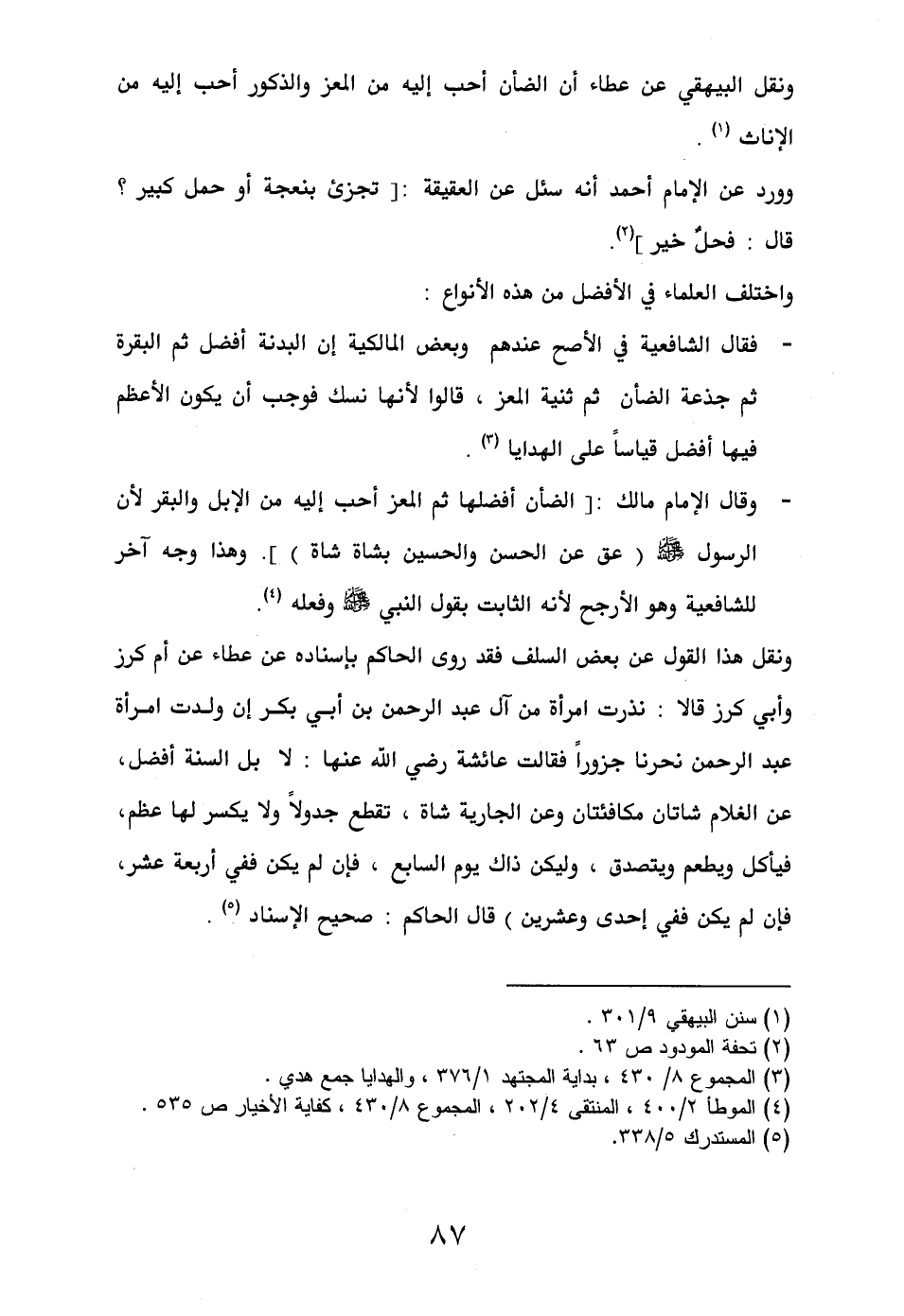 - وقال الإمام مالك: [الضأن أفضلها ثم المعز أحب إليه من الإبل والبقر لأن الرسول - صلى الله عليه وسلم - (عق عن الحسن والحسين بشاة شاة)]. وهذا وجه آخر للشافعية وهو الأرجح لأنه الثابت بقول النبي - صلى الله عليه وسلم - وفعله (¬4).