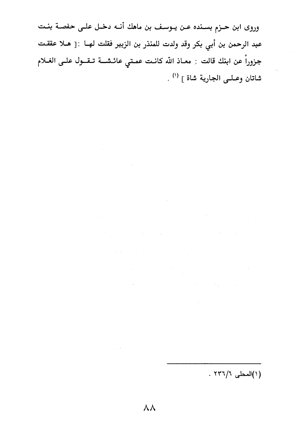 وروى ابن حزم بسنده عن يوسف بن ماهك أنه دخل على حفصة بنت عبد الرحمن بن أبي بكر وقد ولدت للمنذر بن الزبير فقلت لها: [هلا عققت جزوراً عن ابنك قالت: معاذ الله كانت عمتي عائشة تقول على الغلام شاتان وعلى الجارية شاة] (¬1).