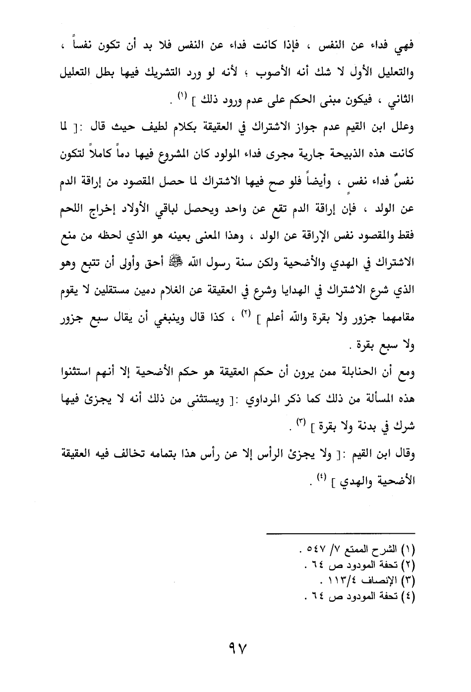 وعلل ابن القيم عدم جواز الاشتراك في العقيقة بكلام لطيف حيث قال: [لما كانت هذه الذبيحة جارية مجرى فداء المولود كان المشروع فيها دماً كاملاً لتكون نفسٌ فداء نفسٍ، وأيضاً فلو صح فيها الاشتراك لما حصل المقصود من إراقة الدم عن الولد، فإن إراقة الدم تقع عن واحد ويحصل لباقي الأولاد إخراج اللحم فقط والمقصود نفس الإراقة عن الولد، وهذا المعنى بعينه هو الذي لحظه من منع الاشتراك في الهدي والأضحية ولكن سنة رسول الله - صلى الله عليه وسلم - أحق وأولى أن تتبع وهو الذي شرع الاشتراك في الهدايا وشرع في العقيقة عن الغلام دمين مستقلين لا يقوم مقامهما جزور ولا بقرة والله أعلم] (¬2)، كذا قال وينبغي أن يقال سبع جزور ولا سبع بقرة.