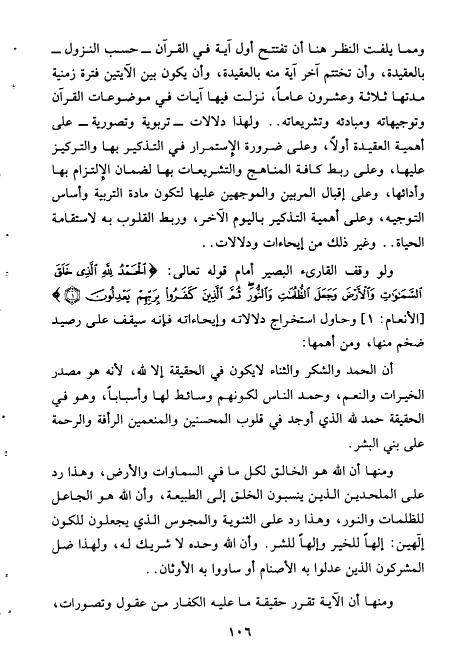 ولو وقف القارئ البصير أمام قوله تعالى: الْحَمْدُ لِلَّهِ الَّذِي خَلَقَ السَّماواتِ وَالْأَرْضَ وَجَعَلَ الظُّلُماتِ وَالنُّورَ ثُمَّ الَّذِينَ كَفَرُوا بِرَبِّهِمْ يَعْدِلُونَ (1) [الأنعام: 1] وحاول استخراج دلالاته وإيحاءاته فإنه سيقف على رصيد ضخم منها، ومن أهمها: