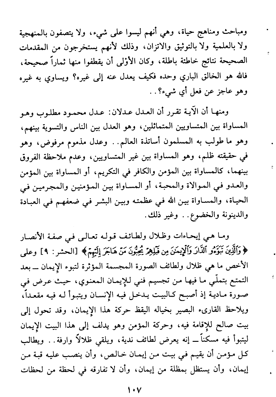 وما هى إيحاءات وظلال ولطائف قوله تعالى فى صفة الأنصار وَالَّذِينَ تَبَوَّؤُا الدَّارَ وَالْإِيمانَ مِنْ قَبْلِهِمْ يُحِبُّونَ مَنْ هاجَرَ إِلَيْهِمْ [الحشر: 9] وعلى الأخص ما هى ظلال ولطائف الصورة المجسمة المؤثرة لتبوء الإيمان- بعد التمتع بتملّى ما فيها من تجسيم فنى للإيمان المعنوى، حيث عرض فى صورة مادية إذ أصبح كالبيت يدخل فيه الإنسان ويتبوأ له فيه مقعدا، ويلاحظ القارئ البصير بخياله اليقظ حركة هذا الإيمان، وقد تحول إلى بيت صالح للإقامة فيه، وحركة المؤمن وهو يدلف إلى هذا البيت الإيمان ليتبوأ فيه مسكنا- إنه يعرض لطائف ندية، ويلقى ظلالا وارفة .. ويطالب كل مؤمن أن يقيم فى بيت من إيمان خالص، وأن ينصب عليه قبة من إيمان، وأن يستظل بمظلة من إيمان، وأن لا تفارقه فى لحظة من لحظات