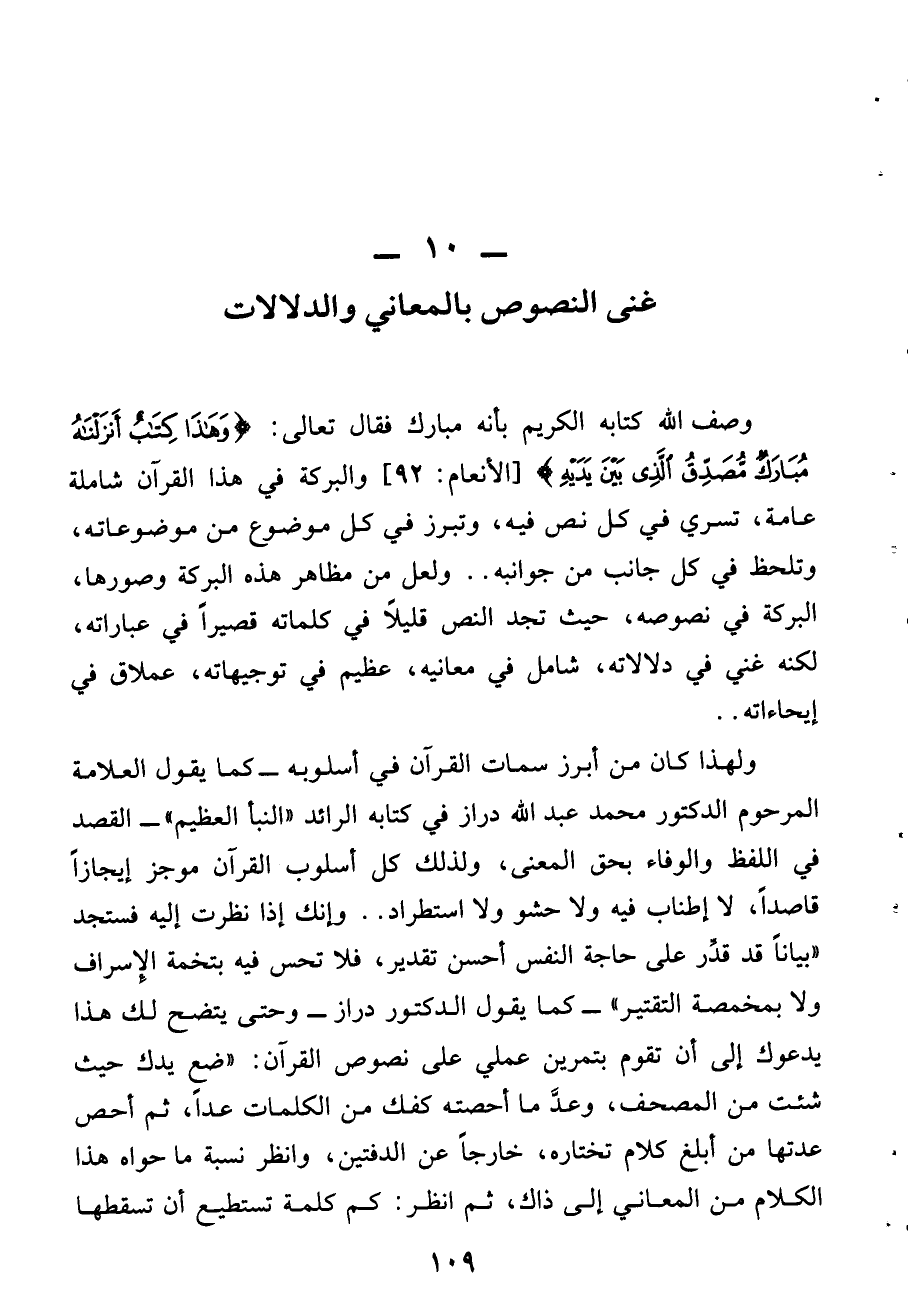 ولهذا كان من أبرز سمات القرآن فى أسلوبه- كما يقول العلامة المرحوم الدكتور محمد عبد الله دراز فى كتابه الرائد «النبأ العظيم» - القصد فى اللفظ والوفاء بحق المعنى، ولذلك كل أسلوب القرآن موجز إيجازا قاصدا، لا إطناب فيه ولا حشو ولا استطراد .. وإنك إذا نظرت إليه فستجد «بيانا قد قدّر على حاجة النفس أحسن تقدير، فلا تحس فيه بتخمة الإسراف ولا بمخمصة التقتير» - كما يقول الدكتور دراز- وحتى يتضح لك هذا يدعوك إلى أن تقوم بتمرين عملى على نصوص القرآن: «ضع يدك حيث شئت من المصحف، وعدّ ما أحصته كفك من الكلمات عدا، ثم أحص عدتها من أبلغ كلام تختاره، خارجا عن الدفتين، وانظر نسبة ما حواه هذا الكلام من المعانى إلى ذاك، ثم انظر: كم كلمة تستطيع أن تسقطها