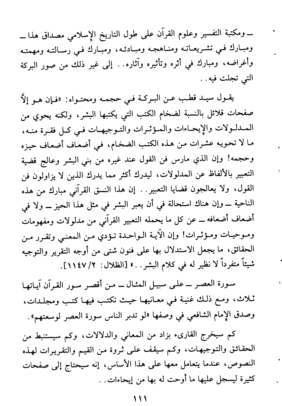 يقول سيد قطب عن البركة فى حجمه ومحتواه: «فإن هو إلّا صفحات قلائل بالنسبة لضخام الكتب التى يكتبها البشر، ولكنه يحوى من المدلولات والإيحاءات والمؤثرات والتوجيهات فى كل فقرة منه، ما لا تحويه عشرات من هذه الكتب الضخام، فى أضعاف أضعاف حيزه وحجمه! وإن الذى مارس فن القول عند غيره من بنى البشر وعالج قضية التعبير بالألفاظ عن المدلولات، ليدرك أكثر مما يدرك الذين لا يزاولون فن القول، ولا يعالجون قضايا التعبير .. إن هذا النسق القرآنى مبارك من هذه الناحية- وإن هناك استحالة فى أن يعبر البشر فى مثل هذا الحيز- ولا فى أضعاف أضعافه- عن كل ما يحمله التعبير القرآنى من مدلولات ومفهومات وموحيات ومؤثرات! وإن الآية الواحدة تؤدى من المعنى وتقرر من الحقائق، ما يجعل الاستدلال بها على فنون شتى من أوجه التقرير والتوجيه شيئا متفردا لا نظير له فى كلام البشر .. » [الظلال: 2/ 1147].