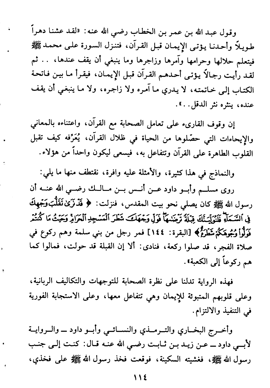 وقول عبد الله بن عمر بن الخطاب رضى الله عنه: «لقد عشنا دهرا طويلا وأحدنا يؤتى الإيمان قبل القرآن، فتنزل السورة على محمد صلّى الله عليه وسلّم فيتعلم حلالها وحرامها وآمرها وزاجرها ولا ما ينبغى أن يقف عنده، ينثره نثر الدقل .. ».