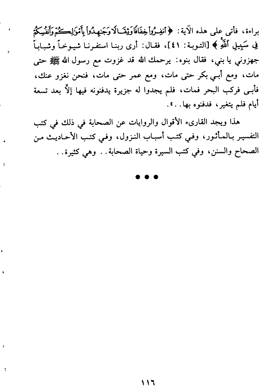 براءة، فأتى على هذه الآية: انْفِرُوا خِفافاً وَثِقالًا وَجاهِدُوا بِأَمْوالِكُمْ وَأَنْفُسِكُمْ فِي سَبِيلِ اللَّهِ [التوبة: 41]، فقال: أرى ربنا استنفرنا شيوخا وشبابا جهزونى يا بنى، فقال بنوه: يرحمك الله قد غزوت مع رسول الله صلّى الله عليه وسلّم حتى مات، ومع أبى بكر حتى مات، ومع عمر حتى مات، فنحن نغزو عنك، فأبى فركب البحر فمات، فلم يجدوا له جزيرة يدفنونه فيها إلّا بعد تسعة أيام فلم يتغير، فدفنوه بها .. ».