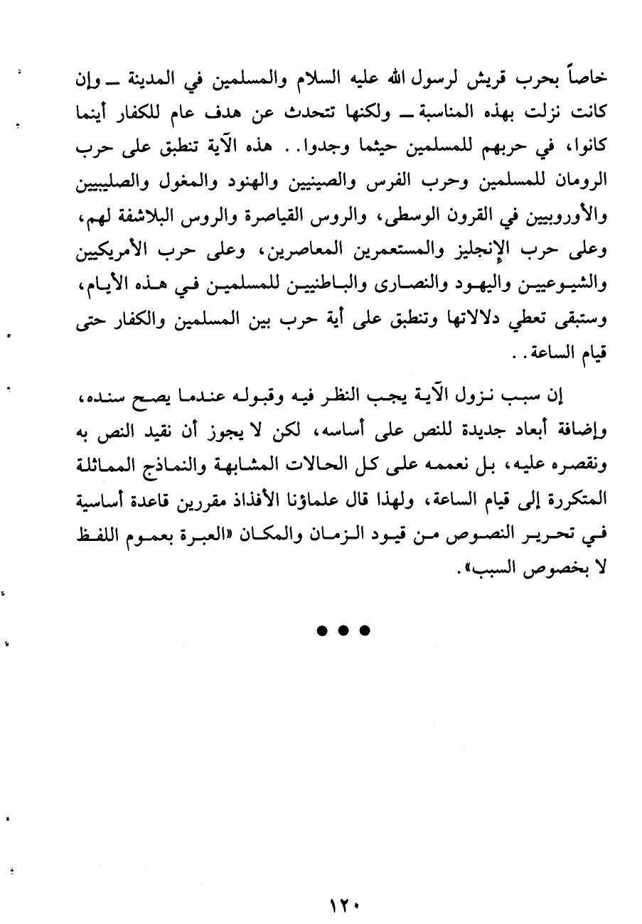 خاصا بحرب قريش لرسول الله عليه السلام والمسلمين فى المدينة- وإن كانت نزلت بهذه المناسبة- ولكنها تتحدث عن هدف عام للكفار أينما كانوا، فى حربهم للمسلمين حيثما وجدوا .. هذه الآية تنطبق على حرب الرومان للمسلمين وحرب الفرس والصينيين والهنود والمغول والصليبيين والأوروبيين فى القرون الوسطى، والروس القياصرة والروس البلاشفة لهم، وعلى حرب الإنجليز والمستعمرين المعاصرين، وعلى حرب الأمريكيين والشيوعيين واليهود والنصارى والباطنيين للمسلمين فى هذه الأيام، وستبقى تعطى دلالاتها وتنطبق على أية حرب بين المسلمين والكفار حتى قيام الساعة ..