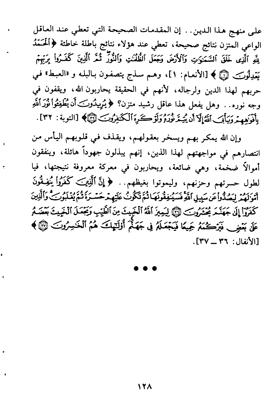 على منهج هذا الدين .. إن المقدمات الصحيحة التى تعطى عند العاقل الواعى المتزن نتائج صحيحة، تعطى عند هؤلاء نتائج باطلة خاطئة الْحَمْدُ لِلَّهِ الَّذِي خَلَقَ السَّماواتِ وَالْأَرْضَ وَجَعَلَ الظُّلُماتِ وَالنُّورَ ثُمَّ الَّذِينَ كَفَرُوا بِرَبِّهِمْ يَعْدِلُونَ (1) [الأنعام: 1]، وهم سذج يتصفون بالبله و «العبط» فى حربهم لهذا الدين ولرجاله، لأنهم فى الحقيقة يحاربون الله، ويقفون فى وجه نوره .. وهل يفعل هذا عاقل رشيد متزن؟ يُرِيدُونَ أَنْ يُطْفِؤُا نُورَ اللَّهِ بِأَفْواهِهِمْ وَيَأْبَى اللَّهُ إِلَّا أَنْ يُتِمَّ نُورَهُ وَلَوْ كَرِهَ الْكافِرُونَ (32) [التوبة: 32].