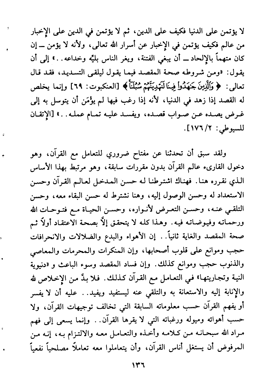 ولقد سبق أن تحدثنا عن مفتاح ضرورى للتعامل مع القرآن، وهو دخول القارئ عالم القرآن بدون مقررات سابقة، وهو مرتبط بهذا الأساس الذى نقرره هنا. فهناك اشترطنا له حسن المدخل لعالم القرآن وحسن الاستعداد له وحسن الوصول إليه، وهنا نشترط له حسن البقاء معه، وحسن التلقى عنه، وحسن التعرض لأنواره، وحسن الحياة مع فتوحات الله ورحماته وفيوضاته فيه. وهذا كله لا يتحقق إلّا بصحة الاعتقاد أولا ثم صحة المقصد والغاية ثانيا .. إن الأهواء والبدع والضلالات والانحرافات حجب وموانع على قلوب أصحابها، وإن المنكرات والمحرمات والمعاصي والذنوب حجب وموانع كذلك. وإن فساد المقصد وسوء الباعث و «دنيوية النية وتجاريتها» فى التعامل مع القرآن كذلك. فلا بدّ من الإخلاص لله والإنابة إليه والاستعانة به والتلقى عنه ليستفيد ويفيد .. عليه أن لا يفسر أو يفهم القرآن حسب معلوماته السابقة التى تخالف توجيهات القرآن، ولا حسب أهوائه وميوله ورغباته التى لا يقرها القرآن .. وإنما يسعى إلى فهم مراد الله سبحانه من كلامه وأخذه والتعامل معه والالتزام به، إنه من المرفوض أن يستغل أناس القرآن، وأن يتعاملوا معه تعاملا مصلحيا نفعيا