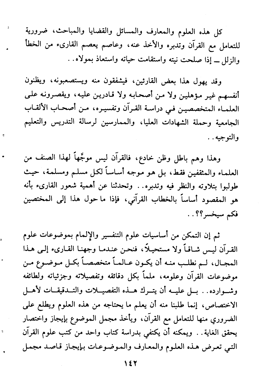 وهذا وهم باطل وظن خادع، فالقرآن ليس موجّها لهذا الصنف من العلماء والمثقفين فقط، بل هو موجه أساسا لكل مسلم ومسلمة، حيث طولبوا بتلاوته والنظر فيه وتدبره .. وتحدثنا عن أهمية شعور القارئ بأنه هو المقصود أساسا بالخطاب القرآنى، فإذا ما حول هذا إلى المختصين فكم سيخسر؟؟ ..