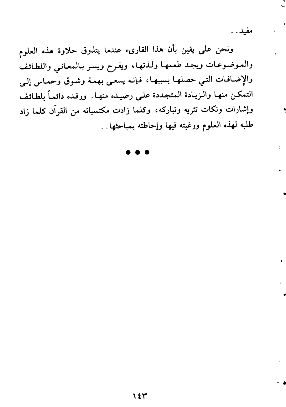 ونحن على يقين بأن هذا القارئ عند ما يتذوق حلاوة هذه العلوم والموضوعات ويجد طعمها ولذتها، ويفرح ويسر بالمعانى واللطائف والإضافات التى حصلها بسببها، فإنه يسعى بهمة وشوق وحماس إلى التمكن منها والزيادة المتجددة على رصيده منها. ورفده دائما بلطائف وإشارات ونكات تثريه وتباركه، وكلما زادت مكتسباته من القرآن كلما زاد طلبه لهذه العلوم ورغبته فيها وإحاطته بمباحثها ..