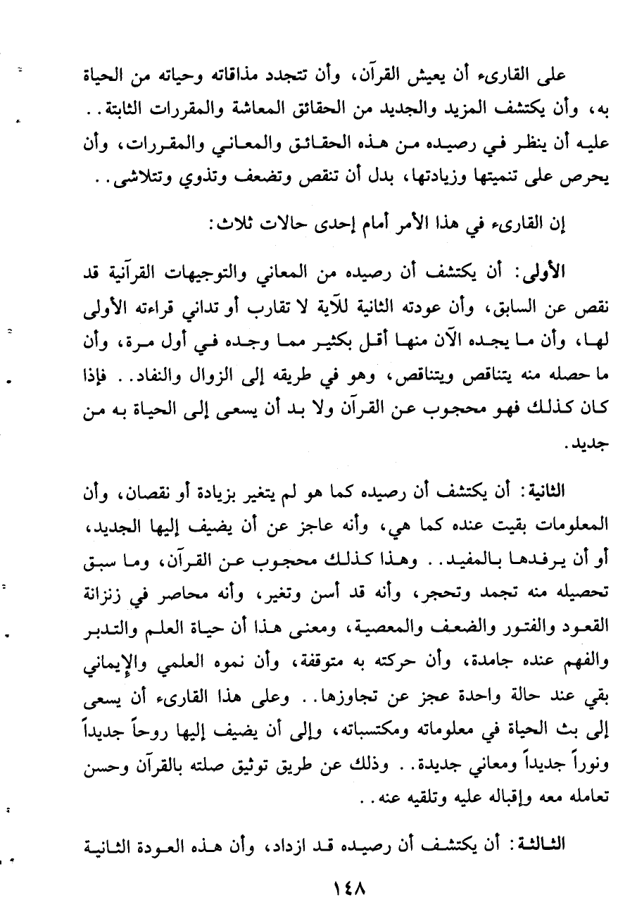 على القارئ أن يعيش القرآن، وأن تتجدد مذاقاته وحياته من الحياة به، وأن يكتشف المزيد والجديد من الحقائق المعاشة والمقررات الثابتة ..