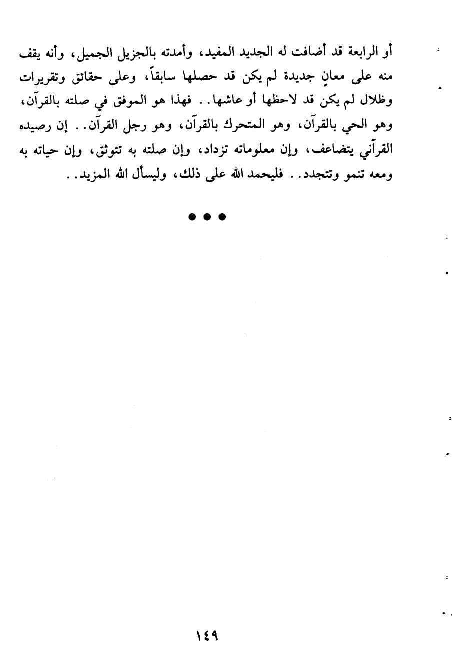 أو الرابعة قد أضافت له الجديد المفيد، وأمدته بالجزيل الجميل، وأنه يقف منه على معان جديدة لم يكن قد حصلها سابقا، وعلى حقائق وتقريرات وظلال لم يكن قد لاحظها أو عاشها .. فهذا هو الموفق فى صلته بالقرآن، وهو الحى بالقرآن، وهو المتحرك بالقرآن، وهو رجل القرآن .. إن رصيده القرآنى يتضاعف، وإن معلوماته تزداد، وإن صلته به تتوثق، وإن حياته به ومعه تنمو وتتجدد .. فليحمد الله على ذلك، وليسأل الله المزيد ..