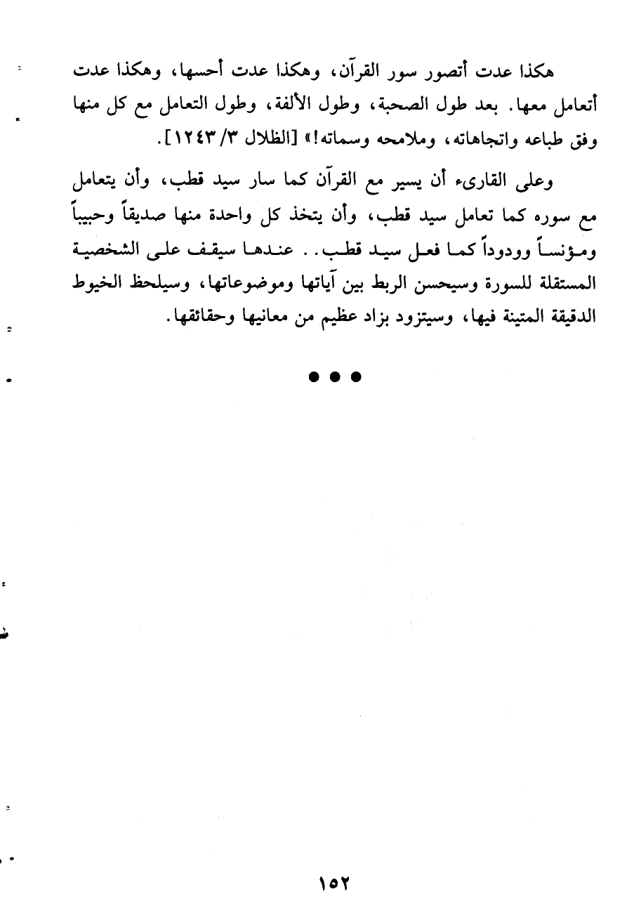 وعلى القارئ أن يسير مع القرآن كما سار سيد قطب، وأن يتعامل مع سوره كما تعامل سيد قطب، وأن يتخذ كل واحدة منها صديقا وحبيبا ومؤنسا وودودا كما فعل سيد قطب .. عندها سيقف على الشخصية المستقلة للسورة وسيحسن الربط بين آياتها وموضوعاتها، وسيلحظ الخيوط الدقيقة المتينة فيها، وسيتزود بزاد عظيم من معانيها وحقائقها.