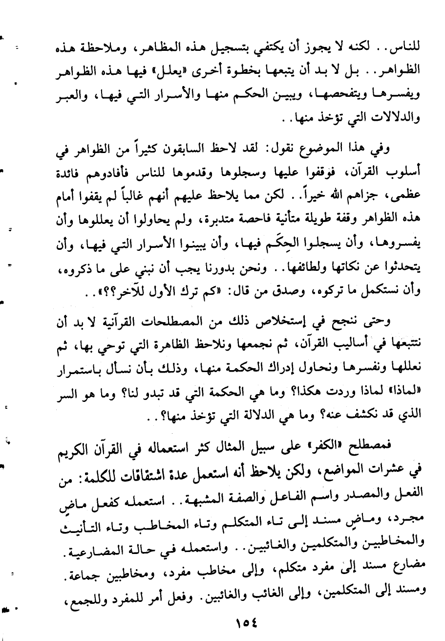 وحتى ننجح فى استخلاص ذلك من المصطلحات القرآنية لا بد أن نتتبعها فى أساليب القرآن، ثم نجمعها ونلاحظ الظاهرة التى توحى بها، ثم نعللها ونفسرها ونحاول إدراك الحكمة منها، وذلك بأن نسأل باستمرار «لماذا» لماذا وردت هكذا؟ وما هى الحكمة التى قد تبدو لنا؟ وما هو السر الذى قد نكشف عنه؟ وما هى الدلالة التى تؤخذ منها؟ ..