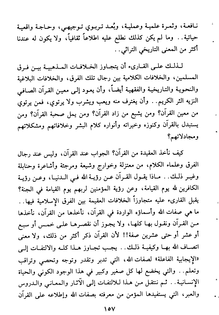 لذلك على القارئ أن يتجاوز الخلافات المذهبية بين فرق المسلمين، والخلافات الكلامية بين رجال تلك الفرق، والخلافات البلاغية والنحوية والتاريخية والفقهية أيضا، وأن يعود إلى معين القرآن الصافى النزيه الثر الكريم .. وأن يغترف منه ويعب ويشرب ولا يرتوى، فمن يرتوى من معين القرآن؟ ومن يشبع من زاد القرآن؟ ومن يمل صحبة القرآن؟ ومن يستبدل بالقرآن وكنوزه وخيراته وأنواره كلام البشر وخلافاتهم ومشكلاتهم ومجادلاتهم؟