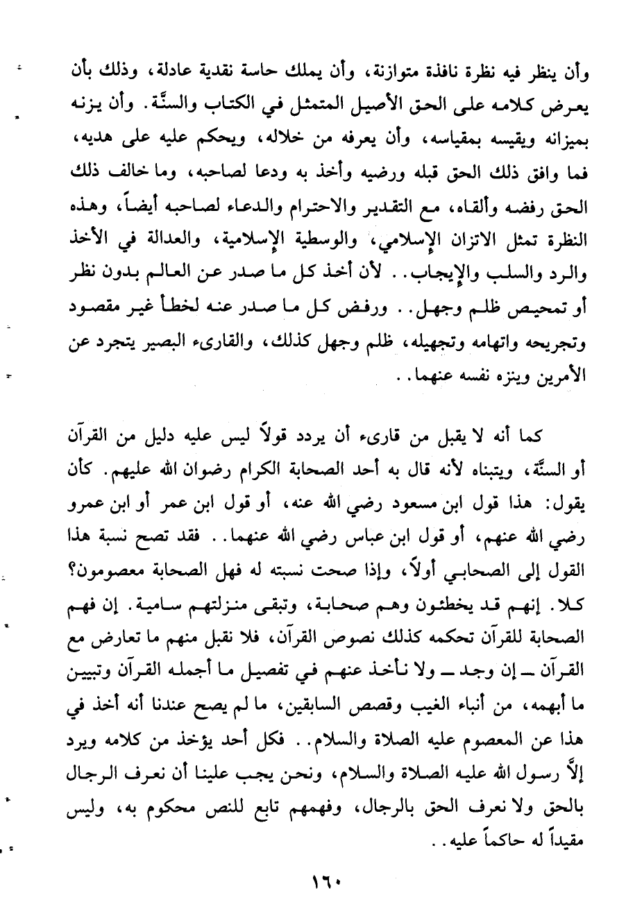 وأن ينظر فيه نظرة نافذة متوازنة، وأن يملك حاسة نقدية عادلة، وذلك بأن يعرض كلامه على الحق الأصيل المتمثل فى الكتاب والسنّة. وأن يزنه بميزانه ويقيسه بمقياسه، وأن يعرفه من خلاله، ويحكم عليه على هديه، فما وافق ذلك الحق قبله ورضيه وأخذ به ودعا لصاحبه، وما خالف ذلك الحق رفضه وألقاه، مع التقدير والاحترام والدعاء لصاحبه أيضا، وهذه النظرة تمثل الاتزان الإسلامى، والوسطية الإسلامية، والعدالة فى الأخذ والرد والسلب والإيجاب .. لأن أخذ كل ما صدر عن العالم بدون نظر أو تمحيص ظلم وجهل .. ورفض كل ما صدر عنه لخطأ غير مقصود وتجريحه واتهامه وتجهيله، ظلم وجهل كذلك، والقارئ البصير يتجرد عن الأمرين وينزه نفسه عنهما ..