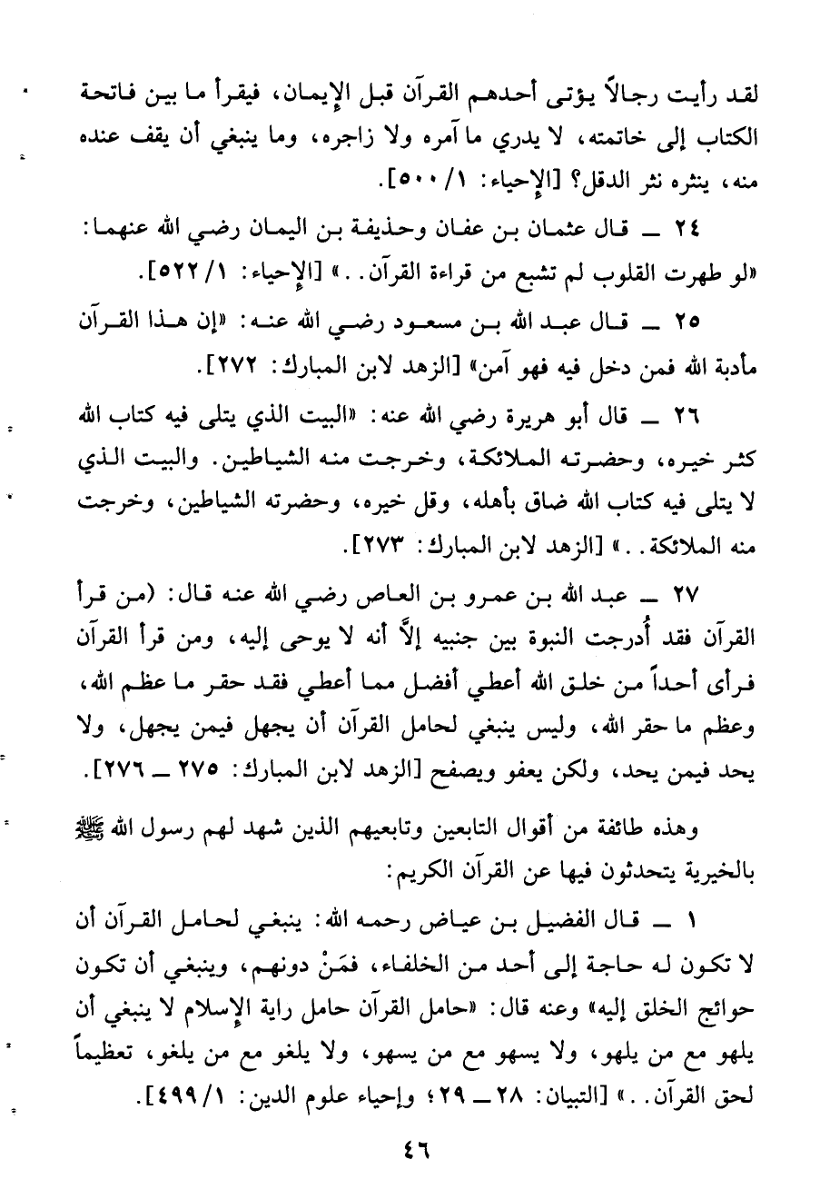 1 - قال الفضيل بن عياض رحمه الله: ينبغى لحامل القرآن أن لا تكون له حاجة إلى أحد من الخلفاء، فمن دونهم، وينبغى أن تكون حوائج الخلق إليه» وعنه قال: «حامل القرآن حامل راية الإسلام لا ينبغى أن يلهو مع من يلهو، ولا يسهو مع من يسهو، ولا يلغو مع من يلغو، تعظيما لحق القرآن .. » [التبيان: 28 - 29؛ وإحياء علوم الدين: 1/ 499].