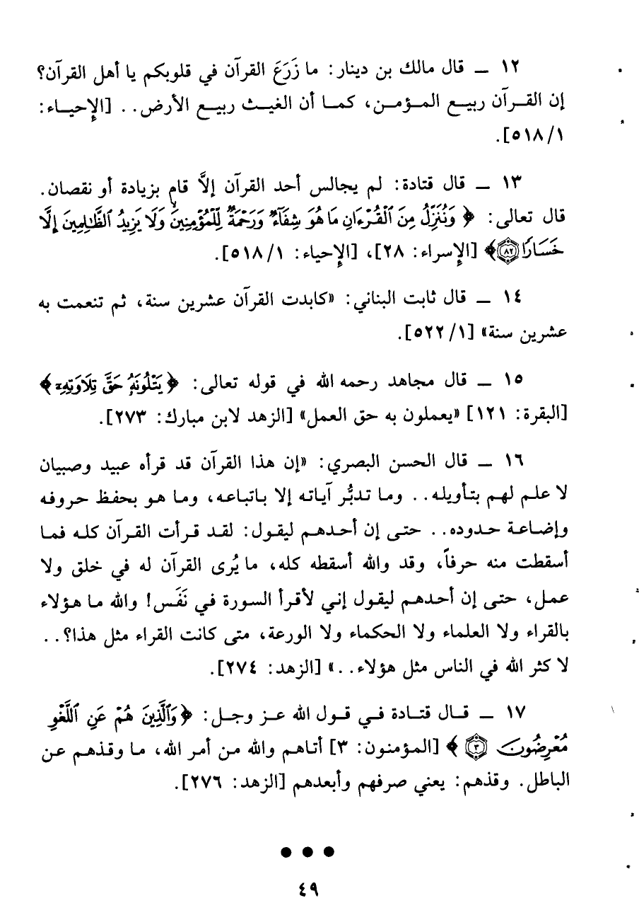 13 - قال قتادة: لم يجالس أحد القرآن إلّا قام بزيادة أو نقصان.