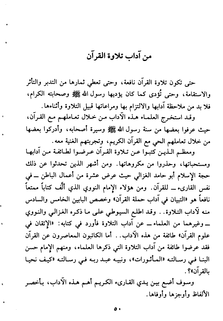ومعظم الذين كتبوا عن تلاوة القرآن عرضوا لطائفة من آدابها ومستحباتها، وحذروا من مكروهاتها. ومن أشهر الذين تحدثوا عن ذلك حجة الإسلام أبو حامد الغزالى حيث عرض عشرة من أعمال الباطن- فى نفس القارئ- للقرآن. ومن هؤلاء الإمام النووى الذى ألّف كتابا ممتعا نافعا هو «التبيان فى آداب حملة القرآن» وخصص البابين الخامس والسادس منه لآداب التلاوة .. وقد اطلع السيوطى على ما ذكره الغزالى والنووى- وغيرهما من العلماء- عن آداب التلاوة فأورد فى كتابه: «الإتقان فى علوم القرآن» طائفة من هذه الآداب .. أما الكاتبون المعاصرون عن القرآن فقد عرضوا طائفة من آداب التلاوة التى ذكرها العلماء، ومنهم الإمام حسن البنا فى رسالته «المأثورات»، ونبيه عبد ربه فى رسالته «كيف نحيا بالقرآن»؟.