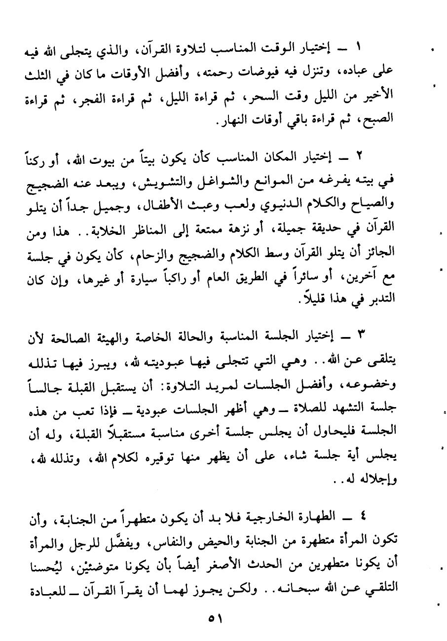 3 - اختيار الجلسة المناسبة والحالة الخاصة والهيئة الصالحة لأن يتلقى عن الله .. وهى التى تتجلى فيها عبوديته لله، ويبرز فيها تذلّله وخضوعه، وأفضل الجلسات لمريد التلاوة: أن يستقبل القبلة جالسا جلسة التشهد للصلاة- وهى أظهر الجلسات عبودية- فإذا تعب من هذه الجلسة فليحاول أن يجلس جلسة أخرى مناسبة مستقبلا القبلة، وله أن يجلس أية جلسة شاء، على أن يظهر منها توقيره لكلام الله، وتذلّله لله، وإجلاله له ..