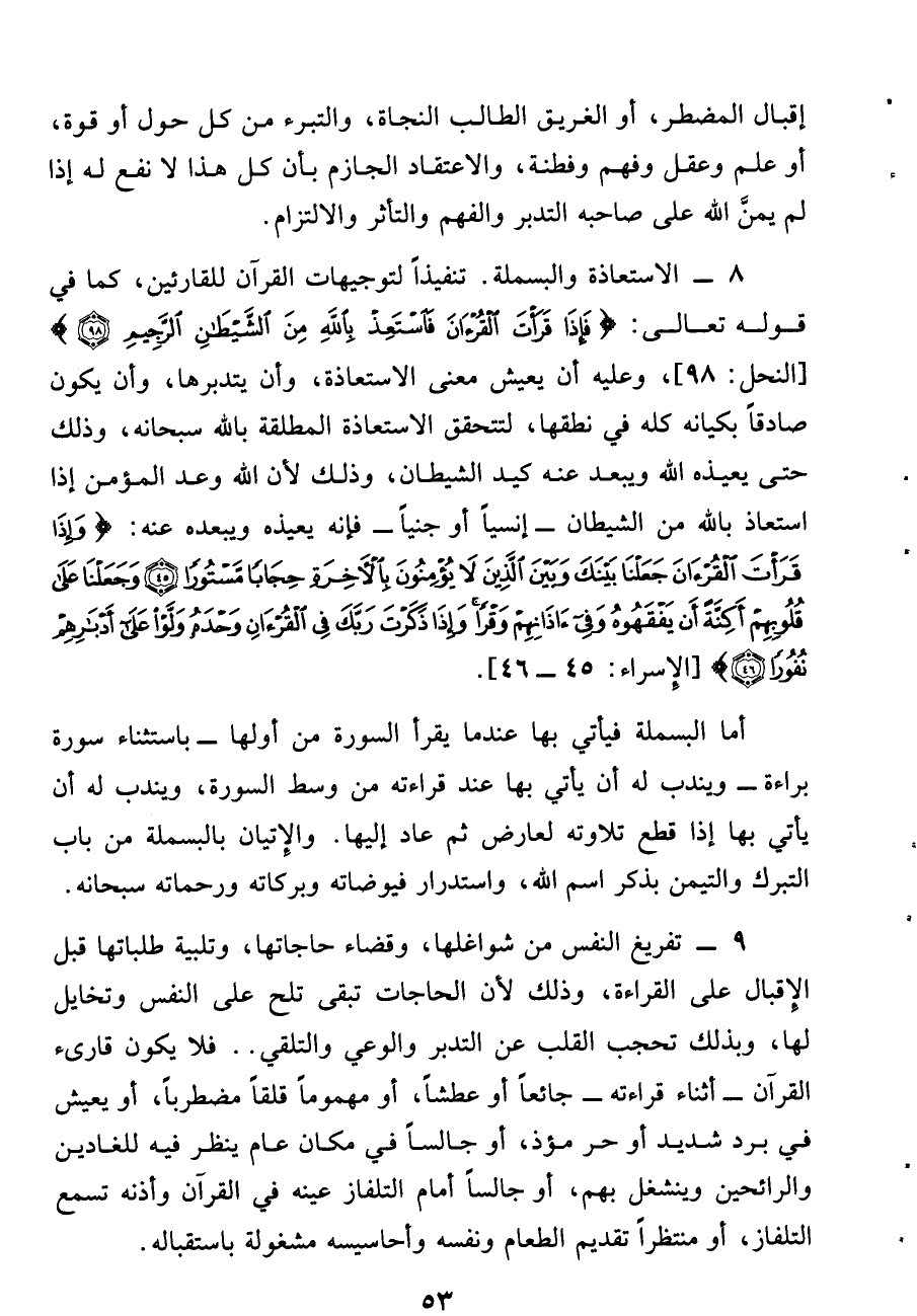 8 - الاستعاذة والبسملة. تنفيذا لتوجيهات القرآن للقارئين، كما فى قوله تعالى: فَإِذا قَرَأْتَ الْقُرْآنَ فَاسْتَعِذْ بِاللَّهِ مِنَ الشَّيْطانِ الرَّجِيمِ (98) [النحل: 98]، وعليه أن يعيش معنى الاستعاذة، وأن يتدبرها، وأن يكون صادقا بكيانه كله فى نطقها، لتتحقق الاستعاذة المطلقة بالله سبحانه، وذلك حتى يعيذه الله ويبعد عنه كيد الشيطان، وذلك لأن الله وعد المؤمن إذا استعاذ بالله من الشيطان- إنسيا أو جنيا- فإنه يعيذه ويبعده عنه: وَإِذا قَرَأْتَ الْقُرْآنَ جَعَلْنا بَيْنَكَ وَبَيْنَ الَّذِينَ لا يُؤْمِنُونَ بِالْآخِرَةِ حِجاباً مَسْتُوراً (45) وَجَعَلْنا عَلى قُلُوبِهِمْ أَكِنَّةً أَنْ يَفْقَهُوهُ وَفِي آذانِهِمْ وَقْراً وَإِذا ذَكَرْتَ رَبَّكَ فِي الْقُرْآنِ وَحْدَهُ وَلَّوْا عَلى أَدْبارِهِمْ نُفُوراً (46) [الإسراء: 45 - 46].