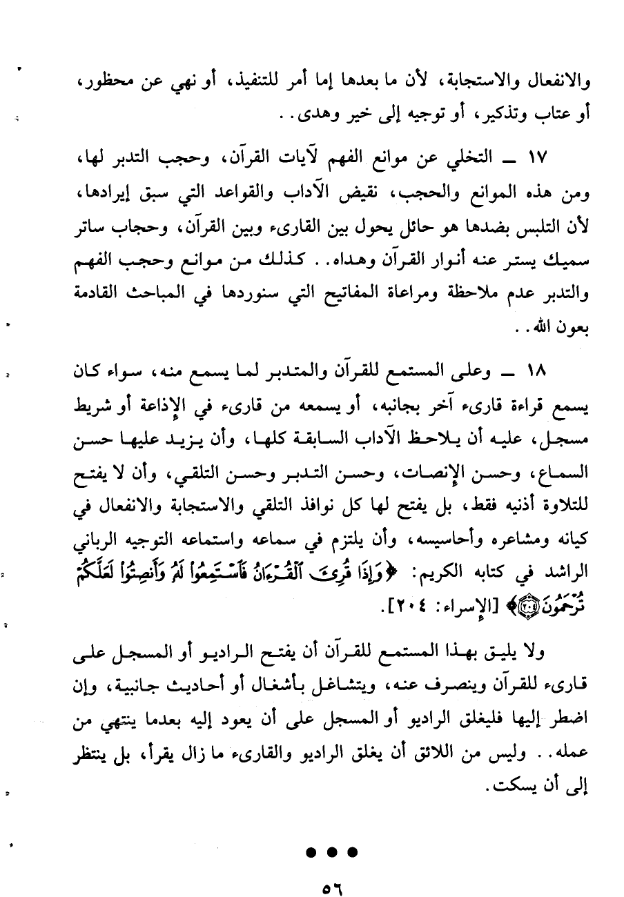 18 - وعلى المستمع للقرآن والمتدبر لما يسمع منه، سواء كان يسمع قراءة قارئ آخر بجانبه، أو يسمعه من قارئ فى الإذاعة أو شريط مسجل، عليه أن يلاحظ الآداب السابقة كلها، وأن يزيد عليها حسن السماع، وحسن الإنصات، وحسن التدبر وحسن التلقى، وأن لا يفتح للتلاوة أذنيه فقط، بل يفتح لها كل نوافذ التلقى والاستجابة والانفعال فى كيانه ومشاعره وأحاسيسه، وأن يلتزم فى سماعه واستماعه التوجيه الربانى الراشد فى كتابه الكريم: وَإِذا قُرِئَ الْقُرْآنُ فَاسْتَمِعُوا لَهُ وَأَنْصِتُوا لَعَلَّكُمْ تُرْحَمُونَ (204) [الإسراء: 204].