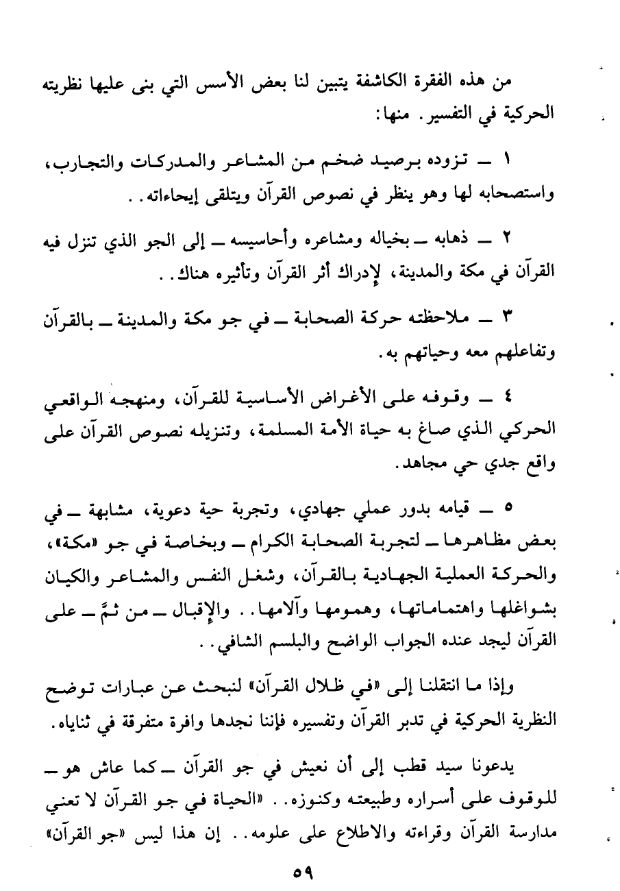 5 - قيامه بدور عملى جهادى، وتجربة حية دعوية، مشابهة- فى بعض مظاهرها- لتجربة الصحابة الكرام- وبخاصة فى جو «مكة»، والحركة العملية الجهادية بالقرآن، وشغل النفس والمشاعر والكيان بشواغلها واهتماماتها، وهمومها وآلامها .. والإقبال- من ثمّ- على القرآن ليجد عنده الجواب الواضح والبلسم الشافى ..