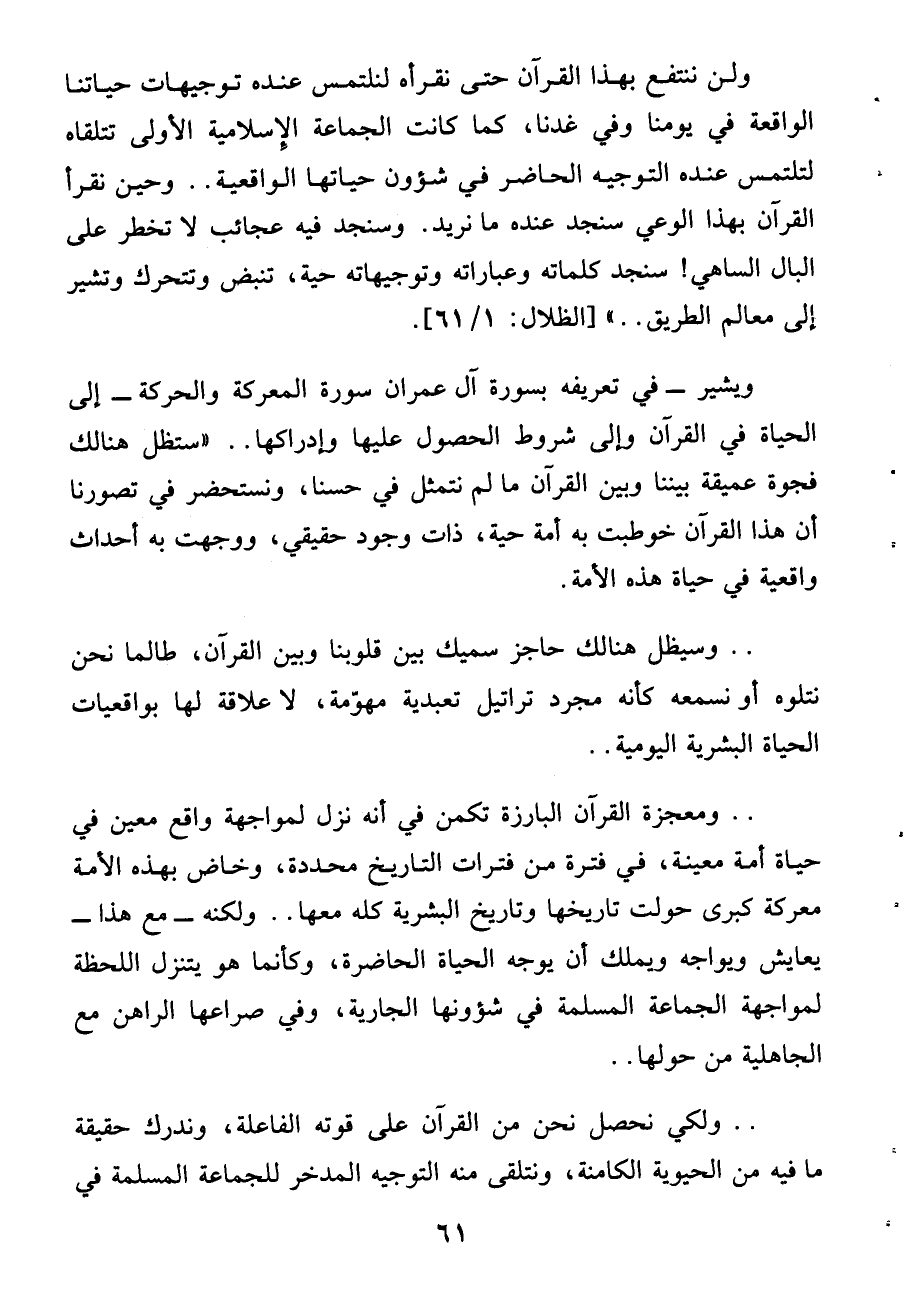 ويشير- فى تعريفه بسورة آل عمران سورة المعركة والحركة- إلى الحياة فى القرآن وإلى شروط الحصول عليها وإدراكها .. «ستظل هنالك فجوة عميقة بيننا وبين القرآن ما لم نتمثل فى حسنا، ونستحضر فى تصورنا أن هذا القرآن خوطبت به أمة حية، ذات وجود حقيقى، ووجهت به أحداث واقعية فى حياة هذه الأمة.