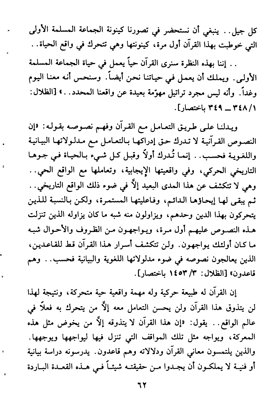 .. إننا بهذه النظرة سنرى القرآن حيا يعمل فى حياة الجماعة المسلمة الأولى. ويملك أن يعمل فى حياتنا نحن أيضا. وسنحس أنه معنا اليوم وغدا. وأنه ليس مجرد تراتيل مهوّمة بعيدة عن واقعنا المحدد .. » [الظلال: 1/ 348 - 349 باختصار].