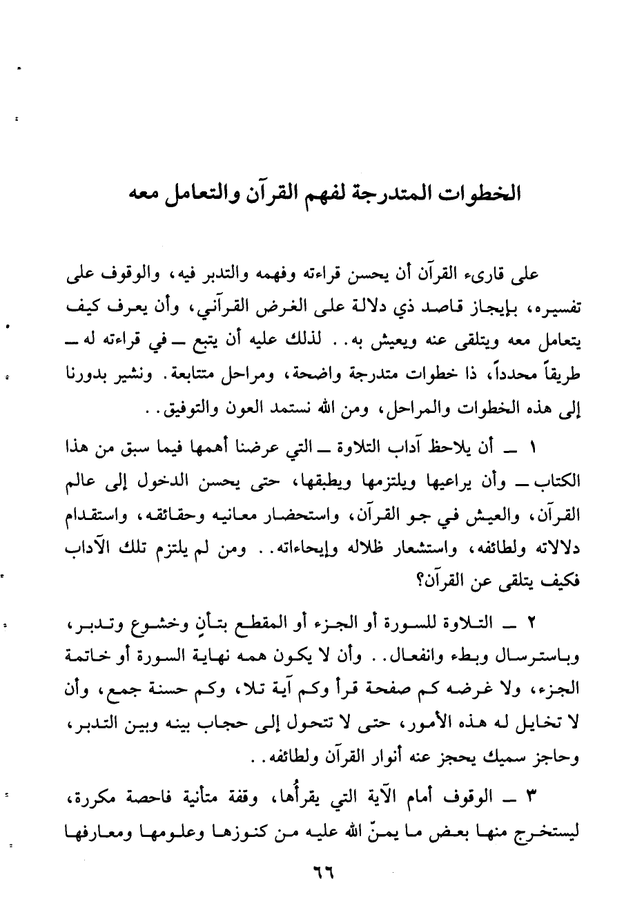 على قارئ القرآن أن يحسن قراءته وفهمه والتدبر فيه، والوقوف على تفسيره، بإيجاز قاصد ذى دلالة على الغرض القرآنى، وأن يعرف كيف يتعامل معه ويتلقى عنه ويعيش به .. لذلك عليه أن يتبع- فى قراءته له- طريقا محددا، ذا خطوات متدرجة واضحة، ومراحل متتابعة. ونشير بدورنا إلى هذه الخطوات والمراحل، ومن الله نستمد