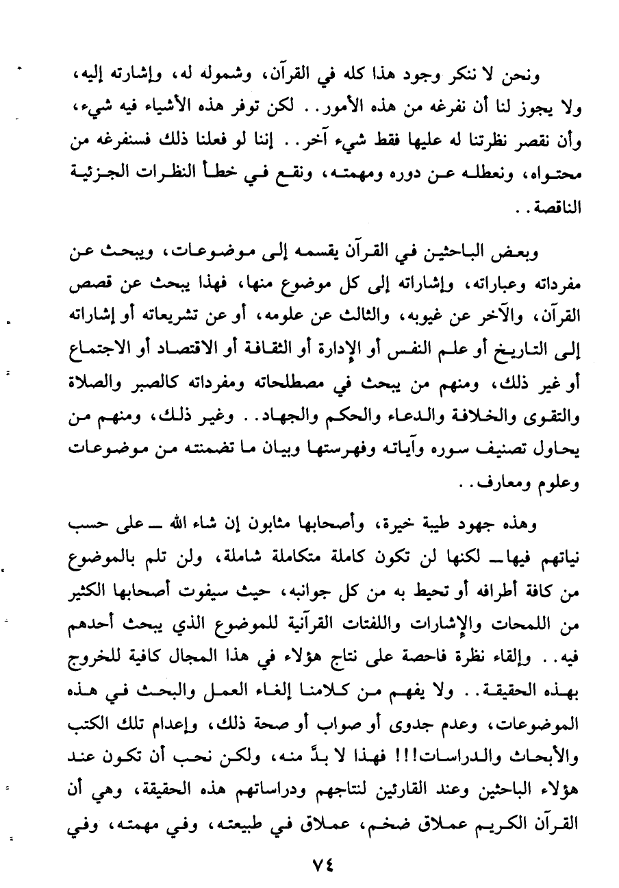 ونحن لا ننكر وجود هذا كله فى القرآن، وشموله له، وإشارته إليه، ولا يجوز لنا أن نفرغه من هذه الأمور .. لكن توفر هذه الأشياء فيه شيء، وأن نقصر نظرتنا له عليها فقط شيء آخر .. إننا لو فعلنا ذلك فسنفرغه من محتواه، ونعطله عن دوره ومهمته، ونقع فى خطأ النظرات الجزئية الناقصة ..