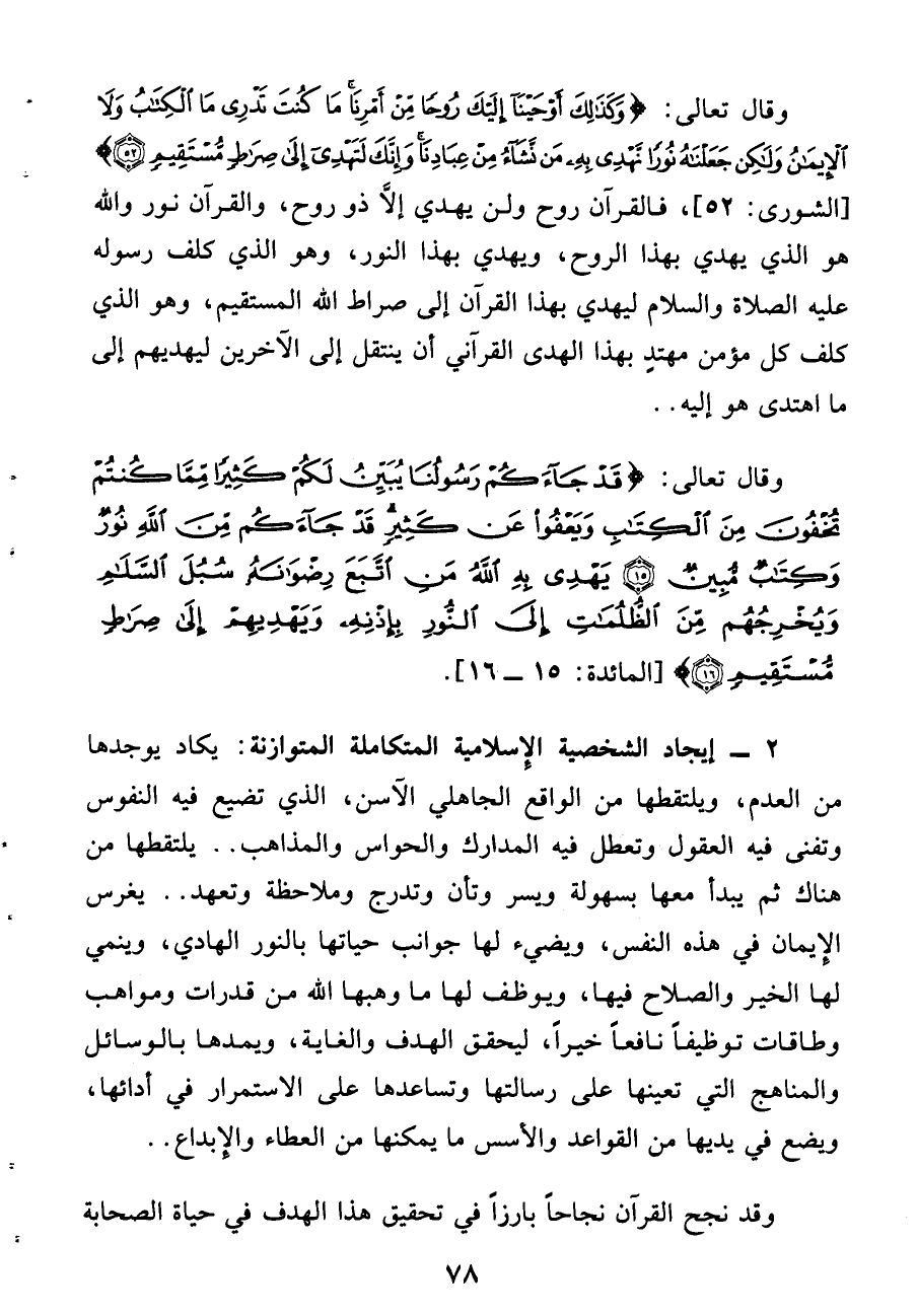 وقال تعالى: وَكَذلِكَ أَوْحَيْنا إِلَيْكَ رُوحاً مِنْ أَمْرِنا ما كُنْتَ تَدْرِي مَا الْكِتابُ وَلَا الْإِيمانُ وَلكِنْ جَعَلْناهُ نُوراً نَهْدِي بِهِ مَنْ نَشاءُ مِنْ عِبادِنا وَإِنَّكَ لَتَهْدِي إِلى صِراطٍ مُسْتَقِيمٍ (52) [الشورى: 52]، فالقرآن روح ولن يهدى إلّا ذو روح، والقرآن نور والله هو الذى يهدى بهذا الروح، ويهدى بهذا النور، وهو الذى كلف رسوله عليه الصلاة والسلام ليهدى بهذا القرآن إلى صراط الله المستقيم، وهو الذى كلف كل مؤمن مهتد بهذا الهدى القرآنى أن ينتقل إلى الآخرين ليهديهم إلى ما اهتدى هو إليه ..