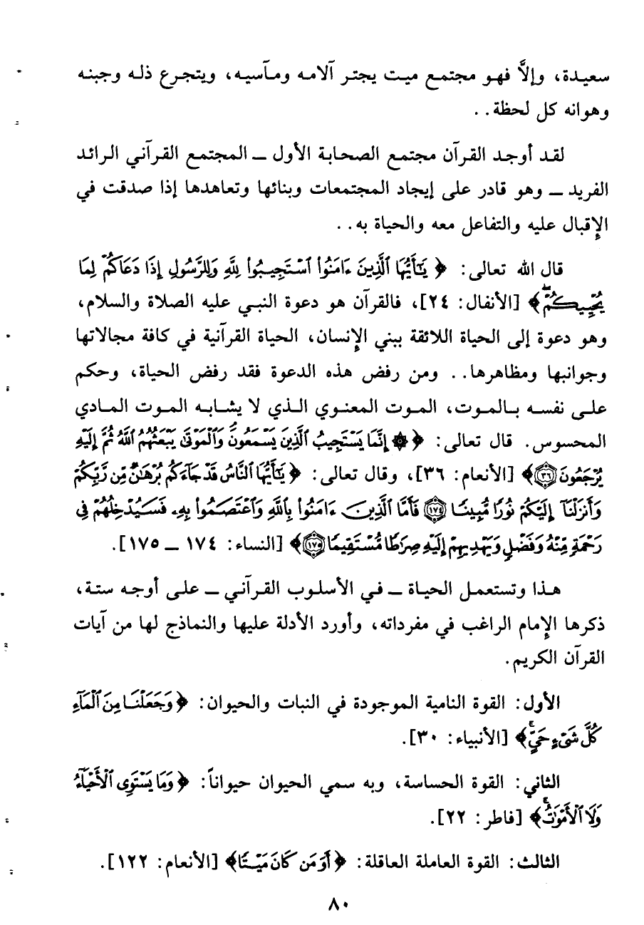 قال الله تعالى: يا أَيُّهَا الَّذِينَ آمَنُوا اسْتَجِيبُوا لِلَّهِ وَلِلرَّسُولِ إِذا دَعاكُمْ لِما يُحْيِيكُمْ [الأنفال: 24]، فالقرآن هو دعوة النبى عليه الصلاة والسلام، وهو دعوة إلى الحياة اللائقة ببنى الإنسان، الحياة القرآنية فى كافة مجالاتها وجوانبها ومظاهرها .. ومن رفض هذه الدعوة فقد رفض الحياة، وحكم على نفسه بالموت، الموت المعنوى الذى لا يشابه الموت المادى المحسوس. قال تعالى: إِنَّما يَسْتَجِيبُ الَّذِينَ يَسْمَعُونَ وَالْمَوْتى يَبْعَثُهُمُ اللَّهُ ثُمَّ إِلَيْهِ يُرْجَعُونَ (36) [الأنعام: 36]، وقال تعالى: يا أَيُّهَا النَّاسُ قَدْ جاءَكُمْ بُرْهانٌ مِنْ رَبِّكُمْ وَأَنْزَلْنا إِلَيْكُمْ نُوراً مُبِيناً (174) فَأَمَّا الَّذِينَ آمَنُوا بِاللَّهِ وَاعْتَصَمُوا بِهِ فَسَيُدْخِلُهُمْ فِي رَحْمَةٍ مِنْهُ وَفَضْلٍ وَيَهْدِيهِمْ إِلَيْهِ صِراطاً مُسْتَقِيماً (175) [النساء: 174 - 175].