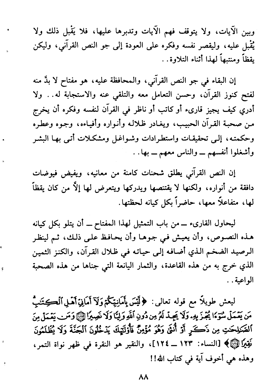 إن البقاء فى جو النص القرآنى، والمحافظة عليه، هو مفتاح لا بدّ منه لفتح كنوز القرآن، وحسن التعامل معه والتلقى عنه والاستجابة له .. ولا أدرى كيف يجيز قارئ أو كاتب أو ناظر فى القرآن لنفسه وفكره أن يخرج من صحبة القرآن الحبيب، ويغادر ظلاله وأنواره وأفياءه، وجوه وعطره وحكمته، إلى تحقيقات واستطرادات