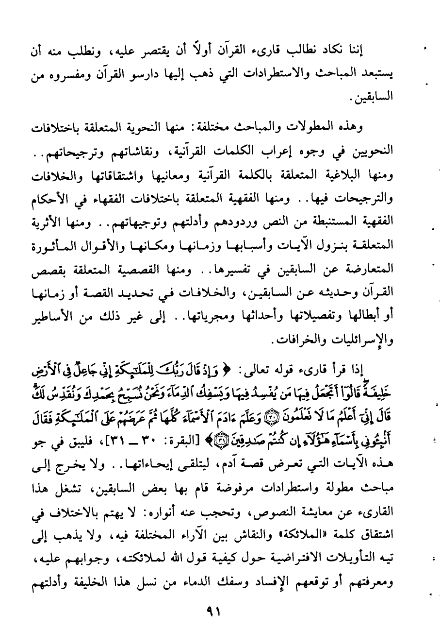 إذا قرأ قارئ قوله تعالى: وَإِذْ قالَ رَبُّكَ لِلْمَلائِكَةِ إِنِّي جاعِلٌ فِي الْأَرْضِ خَلِيفَةً قالُوا أَتَجْعَلُ فِيها مَنْ يُفْسِدُ فِيها وَيَسْفِكُ الدِّماءَ وَنَحْنُ نُسَبِّحُ بِحَمْدِكَ وَنُقَدِّسُ لَكَ قالَ إِنِّي أَعْلَمُ ما لا تَعْلَمُونَ (30) وَعَلَّمَ آدَمَ الْأَسْماءَ كُلَّها ثُمَّ عَرَضَهُمْ عَلَى الْمَلائِكَةِ فَقالَ أَنْبِئُونِي بِأَسْماءِ هؤُلاءِ إِنْ كُنْتُمْ صادِقِينَ (31) [البقرة: 30 - 31]، فليبق فى جو هذه الآيات التى تعرض قصة آدم، ليتلقى إيحاءاتها .. ولا يخرج إلى مباحث مطولة واستطرادات مرفوضة قام بها بعض السابقين، تشغل هذا القارئ عن معايشة النصوص، وتحجب عنه أنواره: لا يهتم بالاختلاف فى اشتقاق كلمة «الملائكة» والنقاش بين الآراء المختلفة فيه، ولا يذهب إلى تيه التأويلات الافتراضية حول كيفية قول الله لملائكته، وجوابهم عليه، ومعرفتهم أو توقعهم الإفساد وسفك الدماء من نسل هذا الخليفة وأدلتهم
