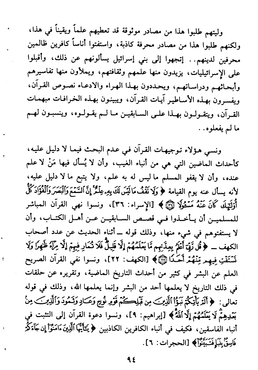 ونسى هؤلاء توجيهات القرآن فى عدم البحث فيما لا دليل عليه، كأحداث الماضين التى هى من أنباء الغيب، وأن لا يسأل فيها من لا علم عنده، وأن لا يقفو المسلم ما ليس له به علم، ولا يتبع ما لا دليل عليه، لأنه يسأل عنه يوم القيامة وَلا تَقْفُ ما لَيْسَ لَكَ بِهِ عِلْمٌ إِنَّ السَّمْعَ وَالْبَصَرَ وَالْفُؤادَ كُلُّ أُولئِكَ كانَ عَنْهُ مَسْؤُلًا (36) [الإسراء: 36]، ونسوا نهى القرآن المباشر للمسلمين أن يأخذوا فى قصص السابقين عن أهل الكتاب، وأن لا يستفتوهم فى شيء منها، وذلك قوله- أثناء الحديث عن عدد أصحاب الكهف- قُلْ رَبِّي أَعْلَمُ بِعِدَّتِهِمْ ما يَعْلَمُهُمْ إِلَّا قَلِيلٌ فَلا تُمارِ فِيهِمْ إِلَّا مِراءً ظاهِراً وَلا تَسْتَفْتِ فِيهِمْ مِنْهُمْ أَحَداً (22) [الكهف: 22]، ونسوا نفى القرآن الصريح العلم عن البشر فى كثير من أحداث التاريخ الماضية، وتقريره عن حلقات فى ذلك التاريخ لا يعلمها أحد من البشر وإنما يعلمها الله، وذلك فى قوله تعالى: أَلَمْ يَأْتِكُمْ نَبَؤُا الَّذِينَ مِنْ قَبْلِكُمْ قَوْمِ نُوحٍ وَعادٍ وَثَمُودَ وَالَّذِينَ مِنْ بَعْدِهِمْ لا يَعْلَمُهُمْ إِلَّا اللَّهُ [إبراهيم: 9]، ونسوا دعوة القرآن إلى التثبت فى أنباء الفاسقين، فكيف فى أنباء الكافرين الكاذبين يا أَيُّهَا الَّذِينَ آمَنُوا إِنْ جاءَكُمْ فاسِقٌ بِنَبَإٍ فَتَبَيَّنُوا [الحجرات: 6].