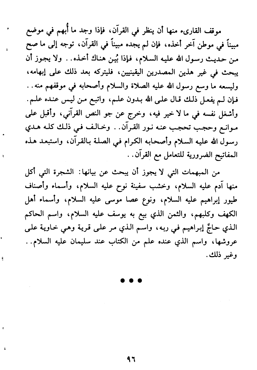 من المبهمات التى لا يجوز أن يبحث عن بيانها: الشجرة التى أكل منها آدم عليه السلام، وخشب سفينة نوح عليه السلام، وأسماء وأصناف طيور إبراهيم عليه السلام، ونوع عصا موسى عليه السلام، وأسماء أهل الكهف وكلبهم، والثمن الذى بيع به يوسف عليه السلام، واسم الحاكم الذى حاجّ إبراهيم فى ربه، واسم الذى مر على قرية وهى خاوية على عروشها، واسم الذى عنده علم من الكتاب عند سليمان عليه السلام ..
