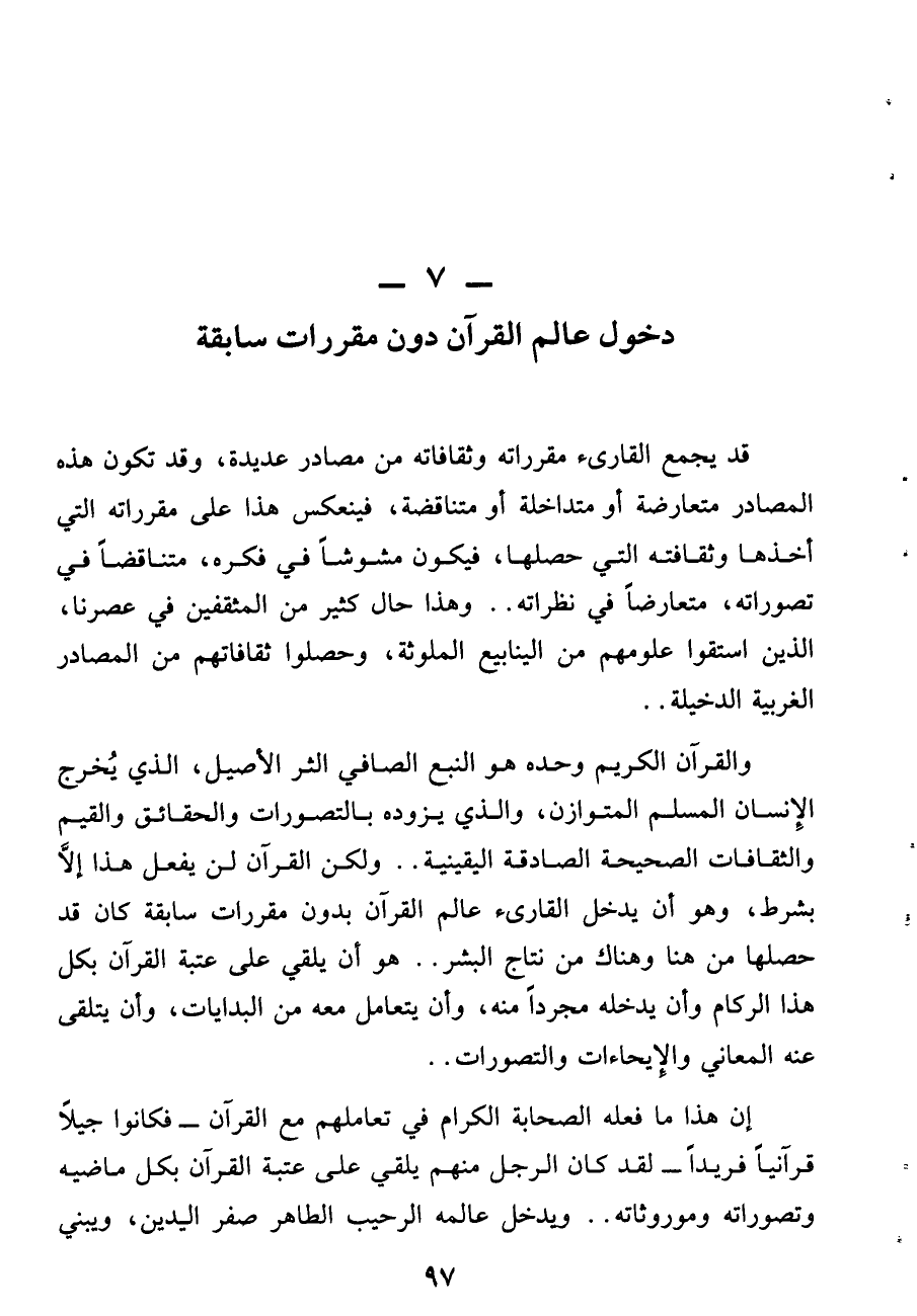 والقرآن الكريم وحده هو النبع الصافى الثر الأصيل، الذى يخرج الإنسان المسلم المتوازن، والذى يزوده بالتصورات والحقائق والقيم والثقافات الصحيحة الصادقة اليقينية .. ولكن القرآن لن يفعل هذا إلّا بشرط، وهو أن يدخل القارئ عالم القرآن بدون مقررات سابقة كان قد حصلها من هنا وهناك من نتاج البشر .. هو أن يلقى على عتبة القرآن بكل هذا الركام وأن يدخله مجردا منه، وأن يتعامل معه من البدايات، وأن يتلقى عنه المعانى والإيحاءات والتصورات ..