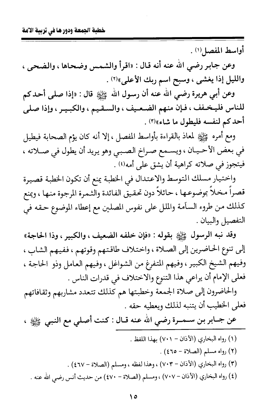 ومع أمره صلى الله عليه وسلم لمعاذ بالقراءة بأواسط المفصل، إلا أنه كان يؤم الصحابة فيطيل في بعض الأحيان، ويسمع صراخ الصبي وهو يريد أن يطول في صلاته، فيتجوز في صلاته كراهية أن يشق على أمه (¬4) .
