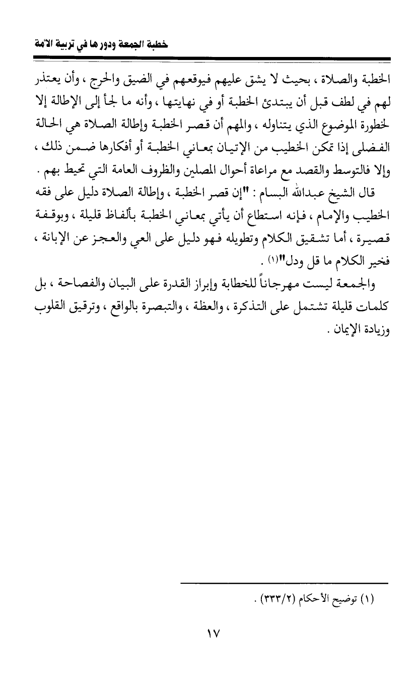الخطبة والصلاة، بحيث لا يشق عليهم فيوقعهم في الضيق والحرج، وأن يعتذر لهم في لطف قبل أن يبتدئ الخطبة أو في نهايتها، وأنه ما لجأ إلى الإطالة إلا لخطورة الموضوع الذي يتناوله، والمهم أن قصر الخطبة وإطالة الصلاة هي الحالة الفضلى إذا تمكن الخطيب من الإتيان بمعاني الخطبة أو أفكارها ضمن ذلك، وإلا فالتوسط والقصد مع مراعاة أحوال المصلين والظروف العامة التي تحيط بهم.