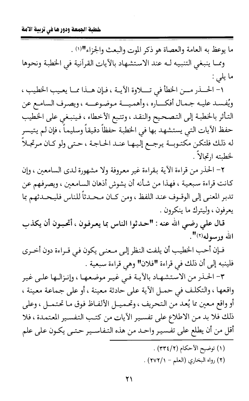 1 - الحذر من الخطأ في تلاوة الآية، فإن هذا مما يعيب الخطيب، ويفسد عليه جمال أفكاره، وأهمية موضوعه، ويصرف السامع عن التأثر بالخطبة إلى التصحيح والنقد، وتتبع الأخطاء، فينبغي على الخطيب حفظ الآيات التي يستشهد بها في الخطبة حفظا دقيقا وسليما، فإن لم يتيسر له ذلك فلتكن مكتوبة يرجع إليها عند الحاجة، حتى ولو كان مرتجلا لخطبته ارتجالا.