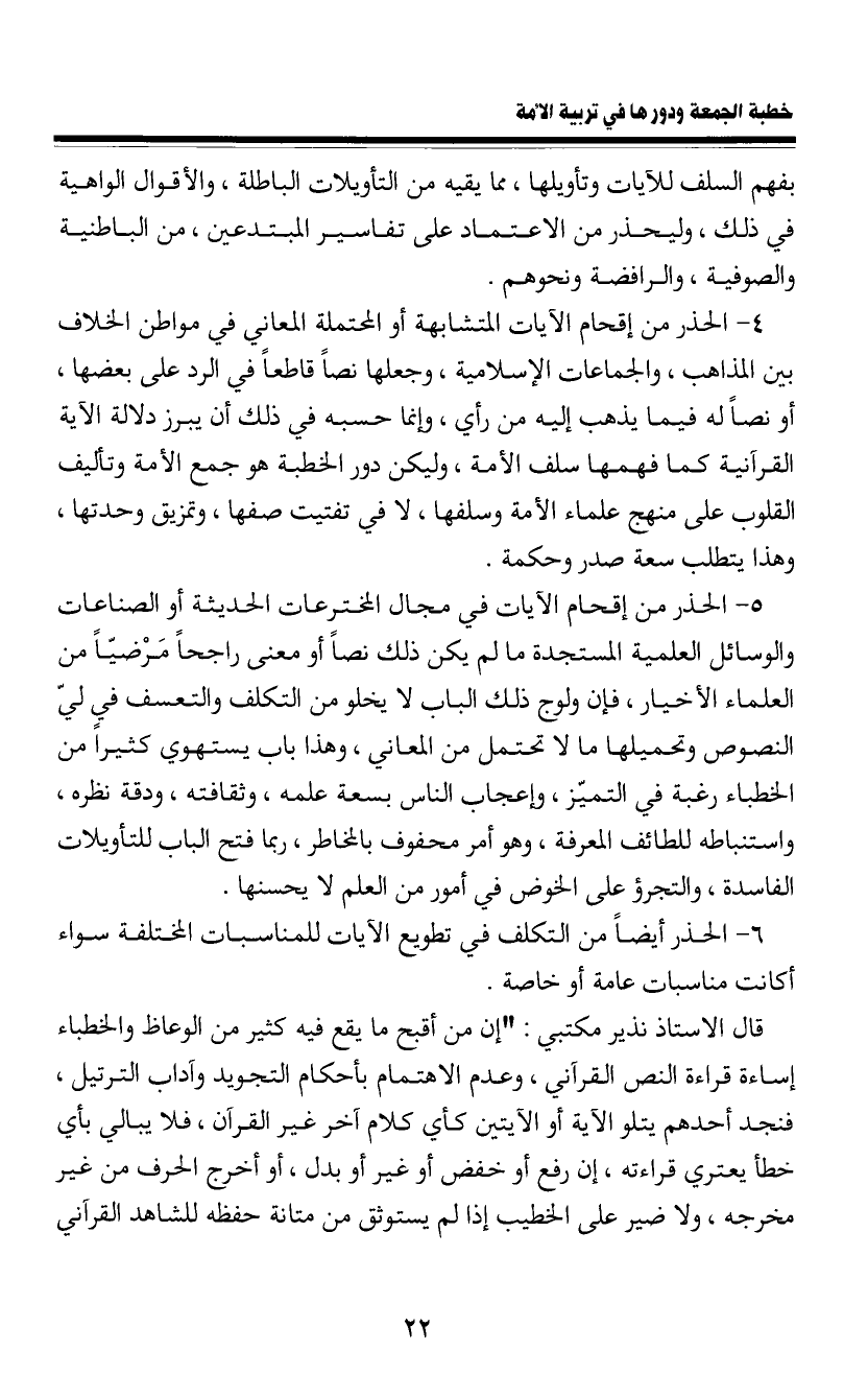 4 - الحذر من إقحام الآيات المتشابهة أو المحتملة المعاني في مواطن الخلاف بين المذاهب، والجماعات الإسلامية، وجعلها نصا قاطعا في الرد على بعضها، أو نصا له فيما يذهب إليه من رأي، وإنما حسبه في ذلك أن يبرز دلالة الآية القرآنية كما فهمها سلف الأمة، وليكن دور الخطبة هو جمع الأمة وتأليف القلوب على منهج علماء الأمة وسلفها، لا في تفتيت صفها، وتمزيق وحدتها، وهذا يتطلب سعة صدر وحكمة.