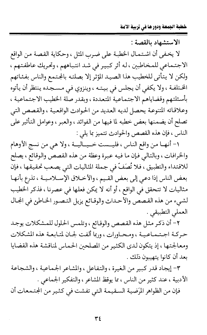 الاستشهاد بالقصة: لا يخفى أن اشتمال الخطبة على ضرب المثل، وحكاية القصة من الواقع الاجتماعي للمخاطبين، له أثر كبير في شد انتباههم، وتحريك عاطفتهم، ولكن لا يتأتى للخطيب هذا الصيد المؤثر إلا بصلته بالمجتمع والناس بفئاتهم المختلفة، ولا يكفي أن يجلس في بيته، وينزوي في مسجده ينتظر أن يأتوه بأسئلتهم وقضاياهم الاجتماعية المتعددة، وبقدر صلة الخطيب الاجتماعية، وعلاقاته المتنوعة يحصل لديه العديد من الحوادث الواقعية، والقصص التي تصلح أن يضمنها بعض خطبه لما فيها من الفوائد، والعبر، وعوامل التأثير على الناس، فإن هذه القصص والحوادث تتميز بما يلي: