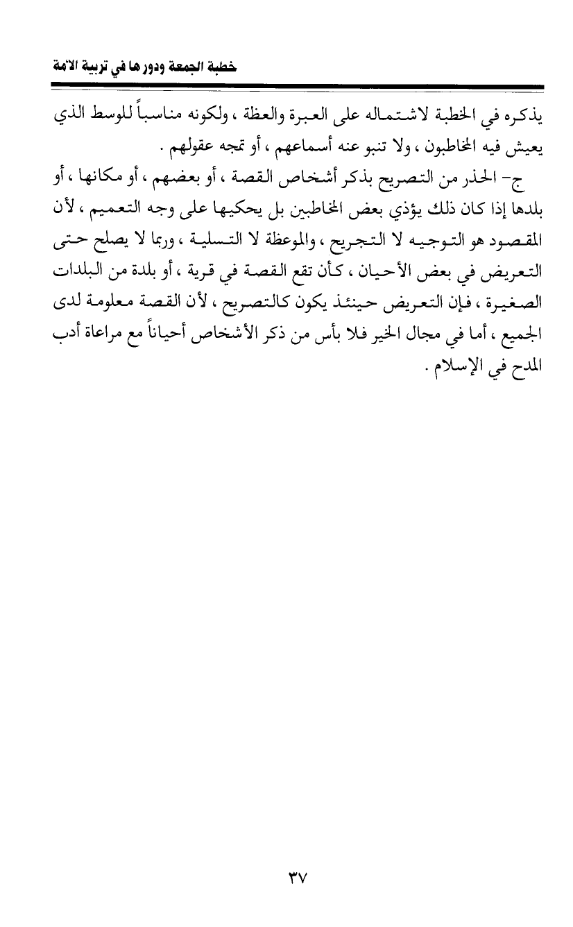 ج- الحذر من التصريح بذكر أشخاص القصة، أو بعضهم، أو مكانها، أو بلدها إذا كان ذلك يؤذي بعض المخاطبين بل يحكيها على وجه التعميم، لأن المقصود هو التوجيه لا التجريح، والموعظة لا التسلية، وربما لا يصلح حتى التعريض في بعض الأحيان، كأن تقع القصة في قرية، أو بلدة من البلدات الصغيرة، فإن التعريض حينئذ يكون كالتصريح، لأن القصة معلومة لدى الجميع، أما في مجال الخير فلا بأس من ذكر الأشخاص أحيانا مع مراعاة أدب المدح في الإسلام.