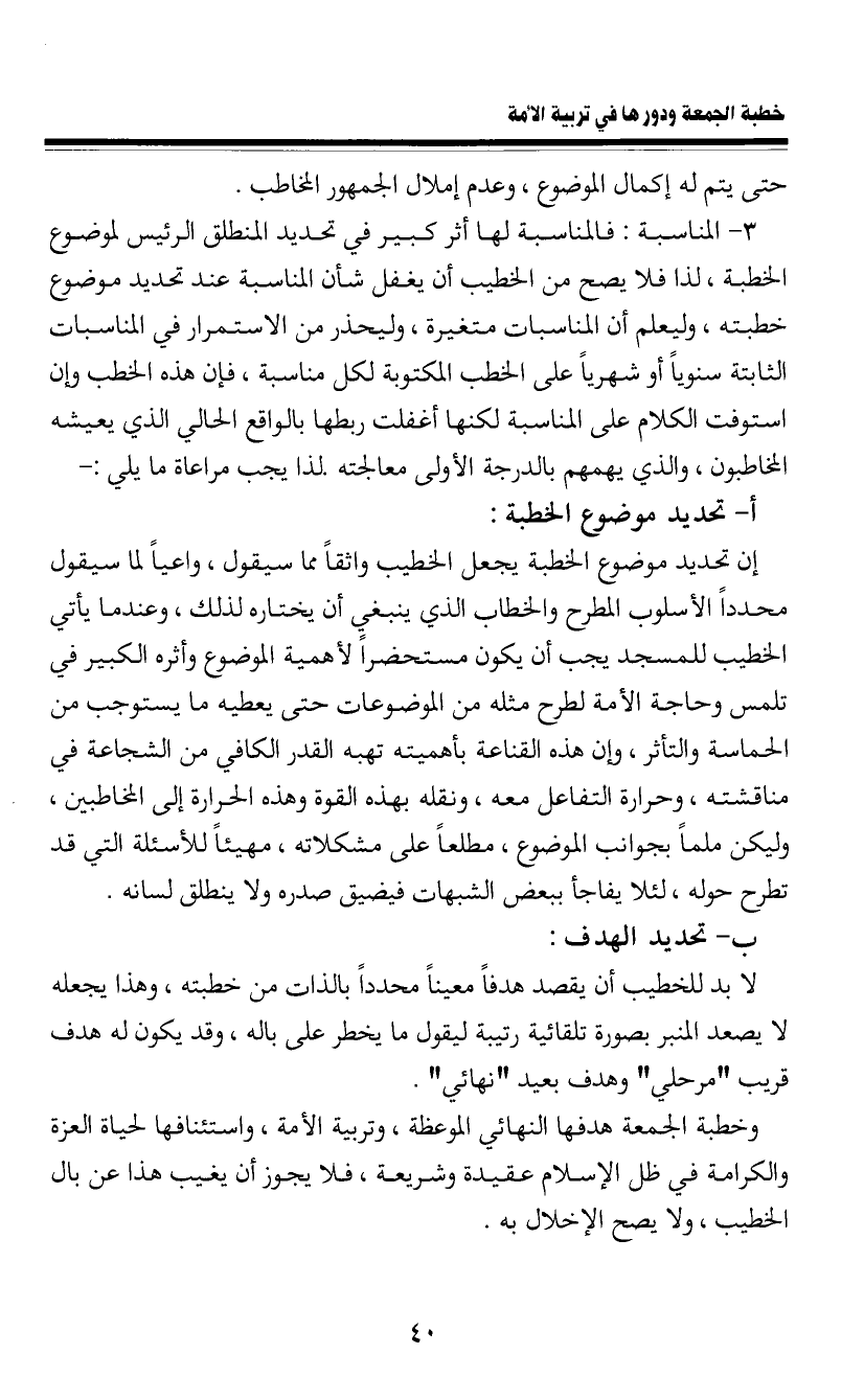 ب- تحديد الهدف: لا بد للخطيب أن يقصد هدفا معينا محددا بالذات من خطبته، وهذا يجعله لا يصعد المنبر بصورة تلقائية رتيبة ليقول ما يخطر على باله، وقد يكون له هدف قريب "مرحلي " وهدف بعيد " نهائي ".