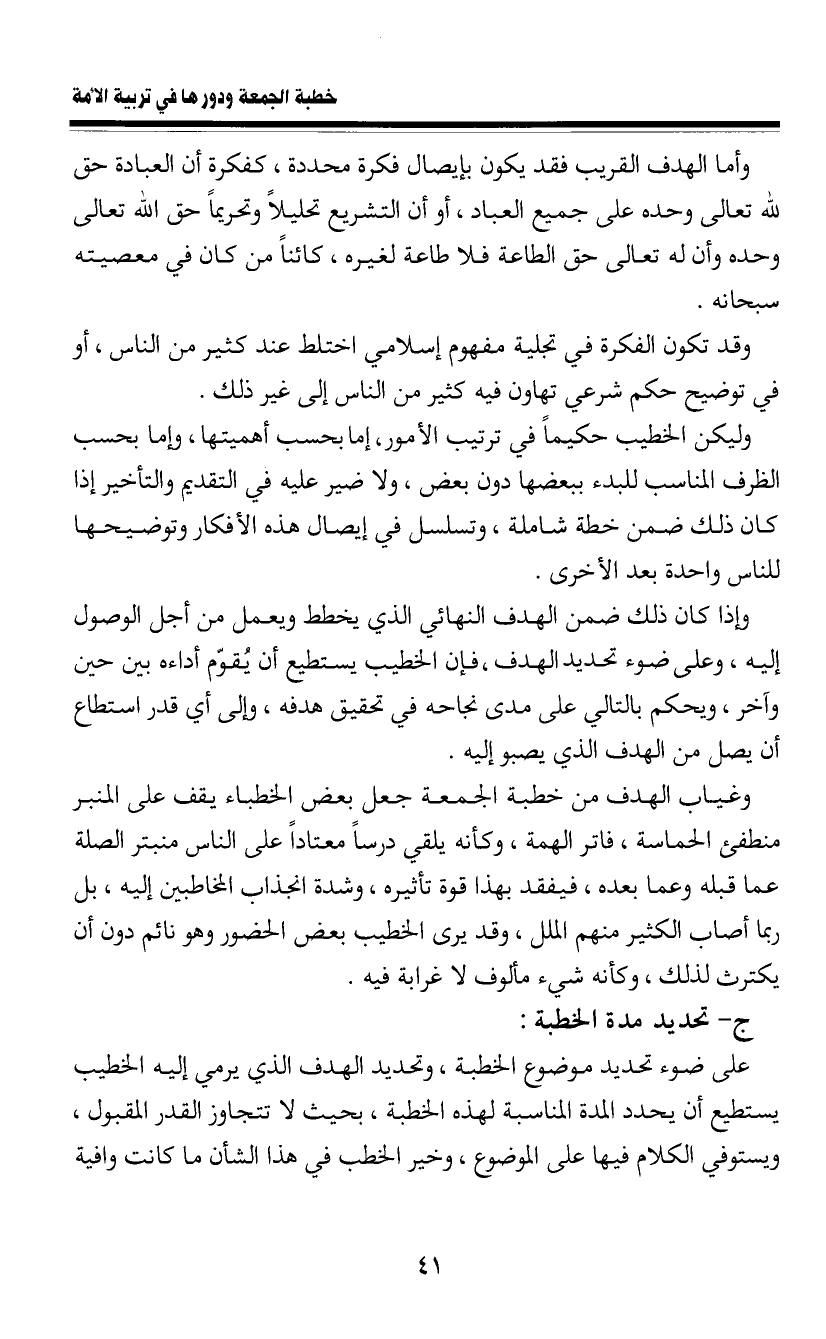 ج- تحديد مدة الخطبة: على ضوء تحديد موضوع الخطبة، وتحديد الهدف الذي يرمي إليه الخطيب يستطيع أن يحدد المدة المناسبة لهذه الخطبة، بحيث لا تتجاوز القدر المقبول، ويستوفي الكلام فيها على الموضوع، وخير الخطب في هذا الشأن ما كانت وافية