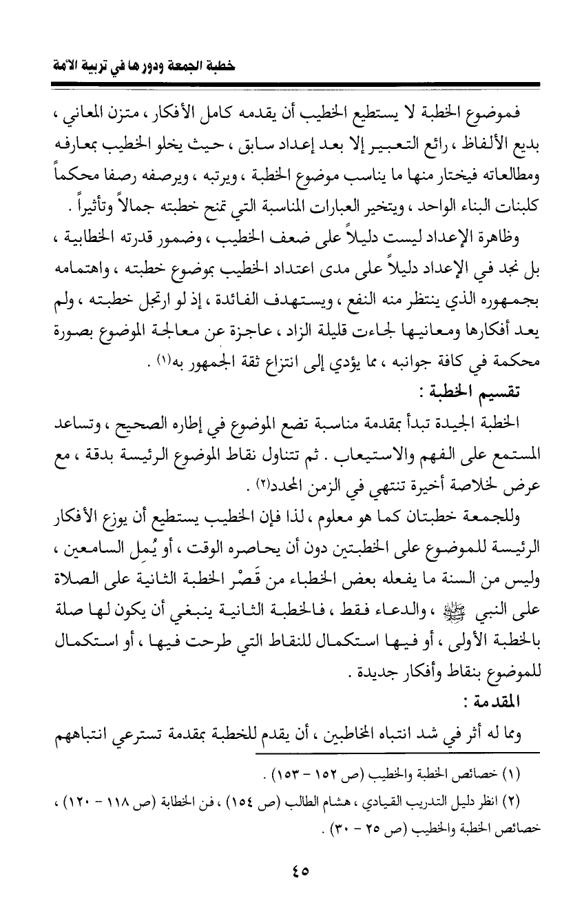 (¬2) انظر دليل التدريب القيادي، هشام الطالب (ص154) ، فن الخطابة (ص118- 120) ، خصائص الخطبة والخطيب (ص25- 30) .