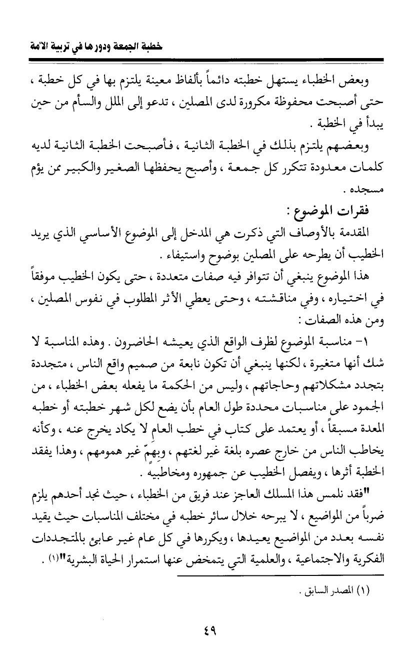 فقرات الموضوع: المقدمة بالأوصاف التي ذكرت هي المدخل إلى الموضوع الأساسي الذي يريد الخطيب أن يطرحه على المصلين بوضوح واستيفاء.